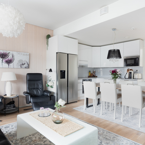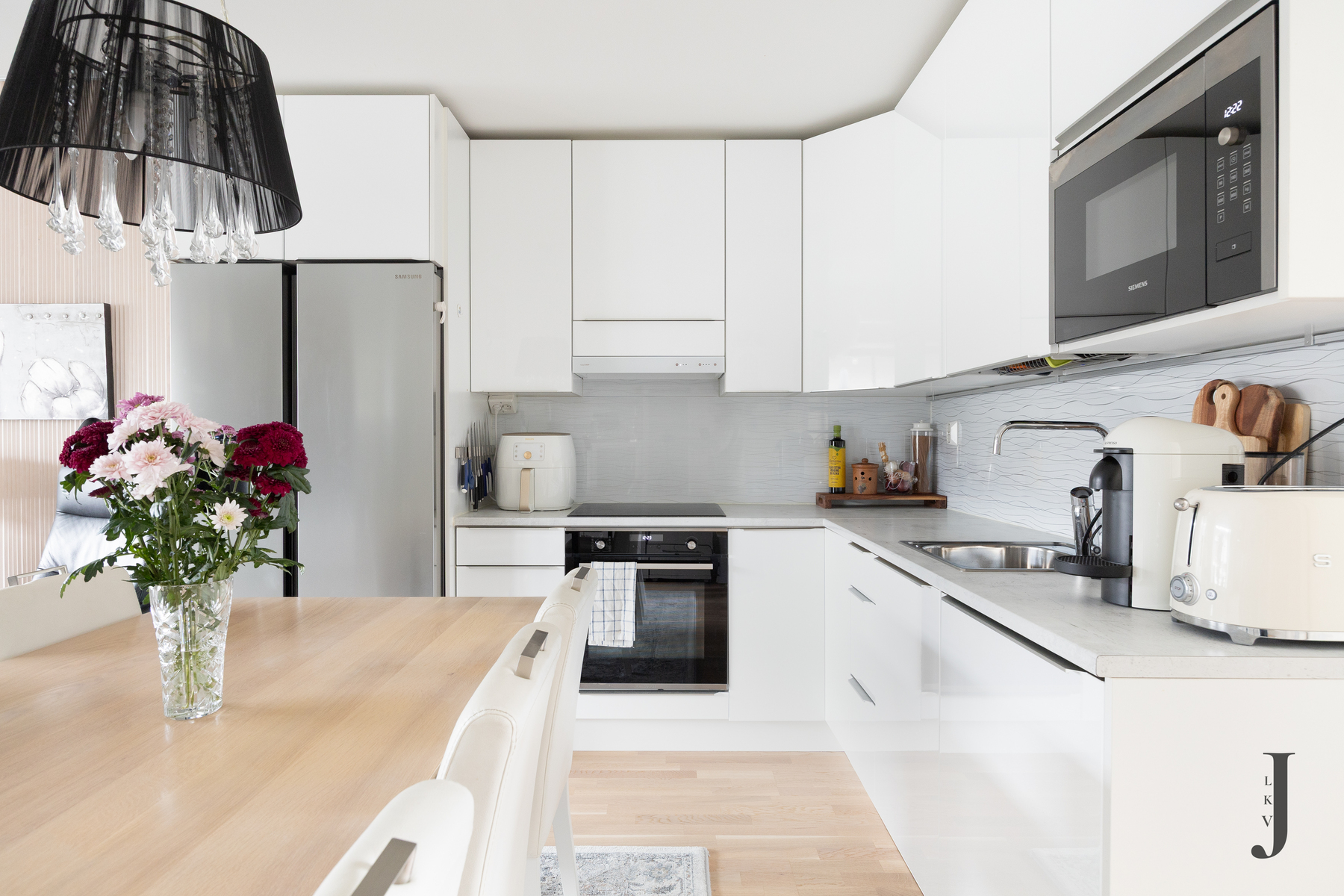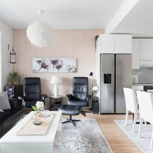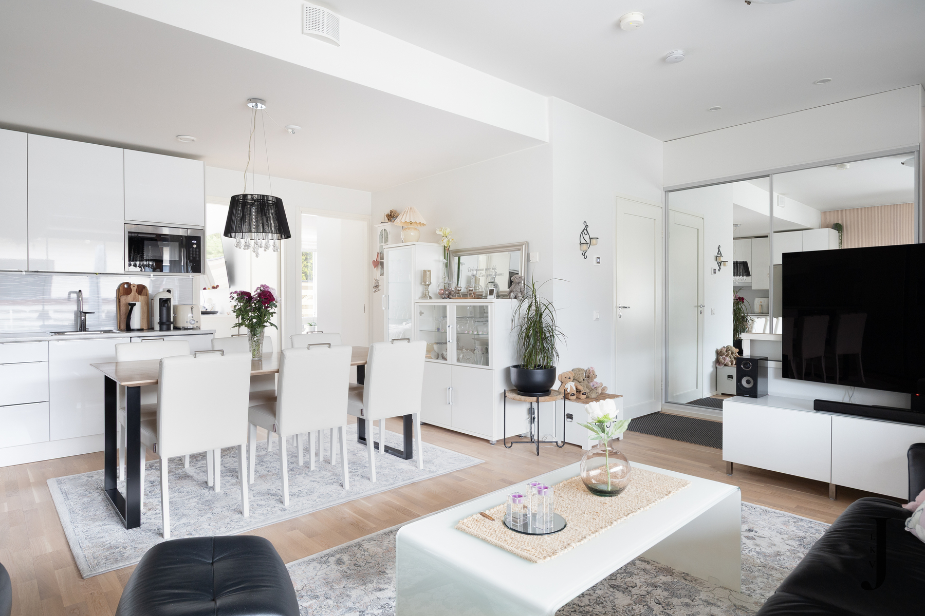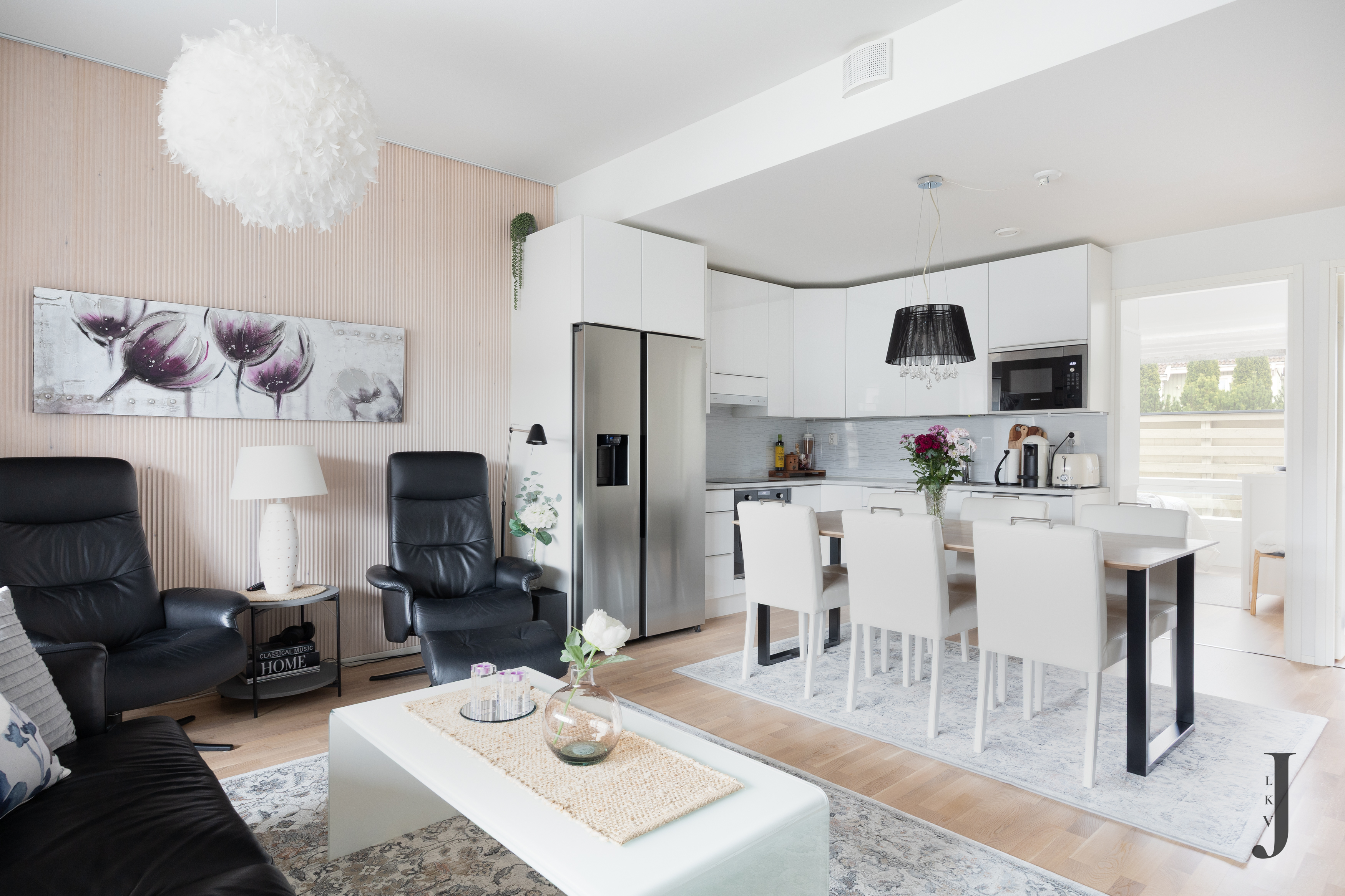Asunnon avokeittiö luo keskipisteen arjen askareille ja perheen yhteisille hetkille. Induktioliedestä ja tilavasta side by side -jääkaappipakastimesta löytyvät kaikki tarvittavat välineet ruoan laittamiseen. Vaaleat parkettilattiat luovat lämpöä koko kotiin, ja olohuoneen tehosteseinä tuo persoonallista tyyliä sisustukseen.