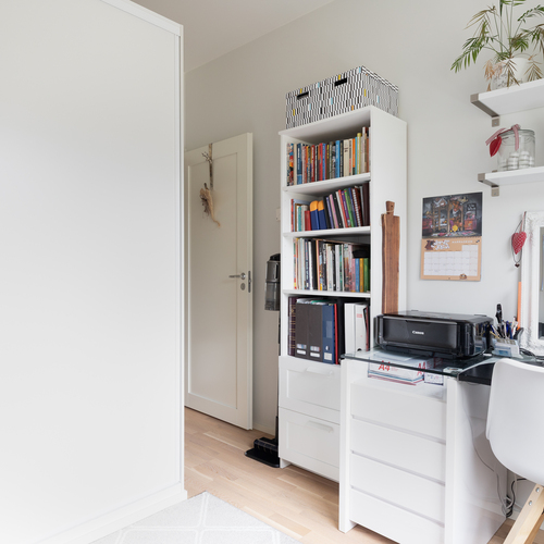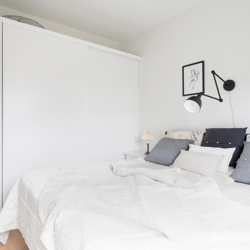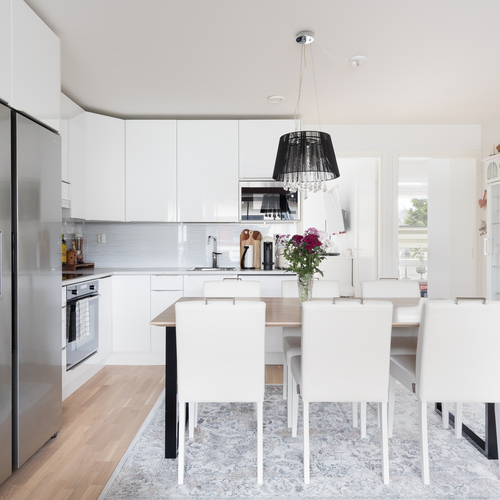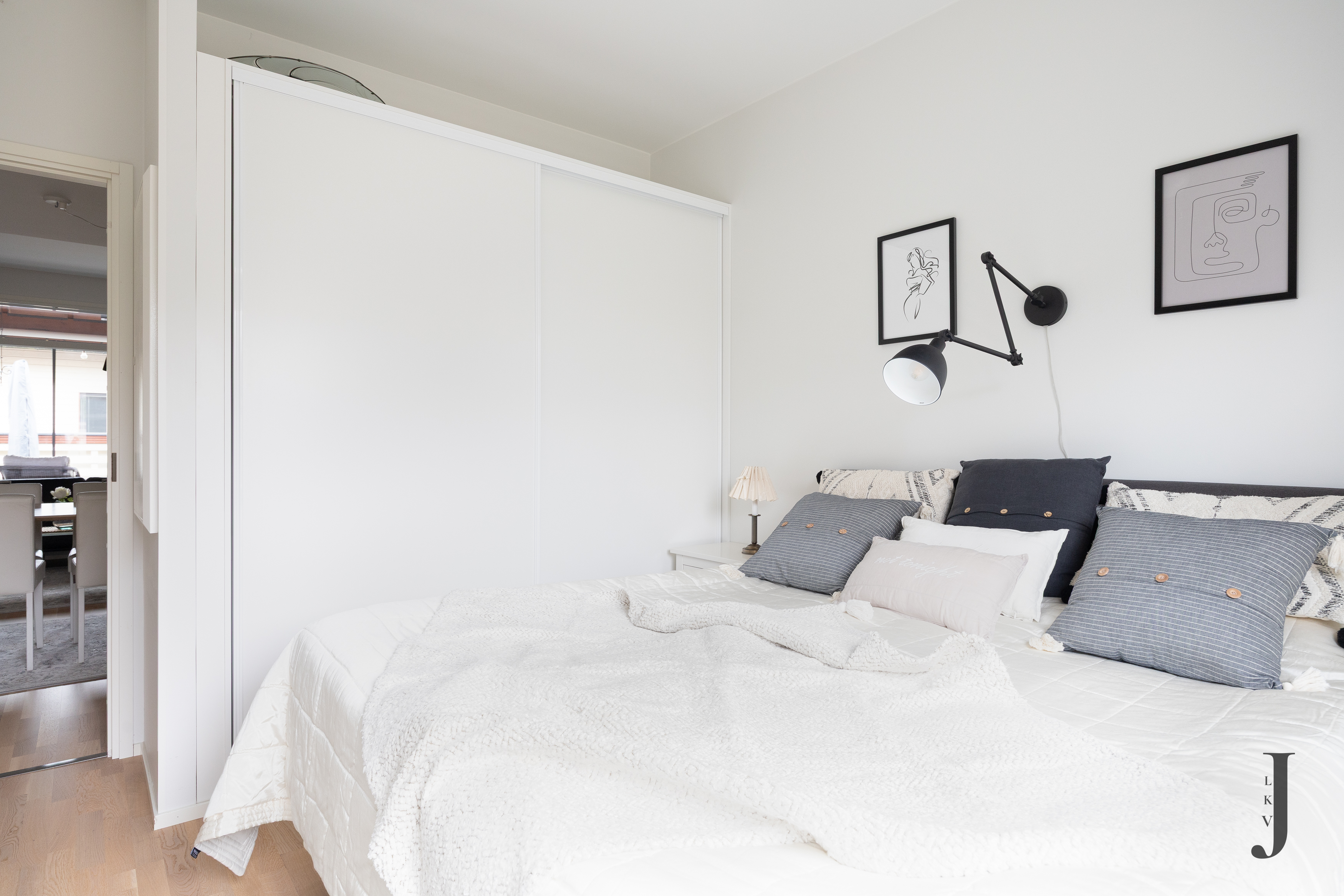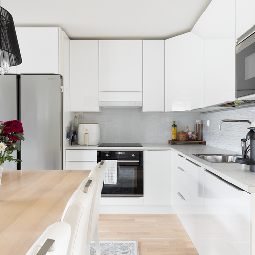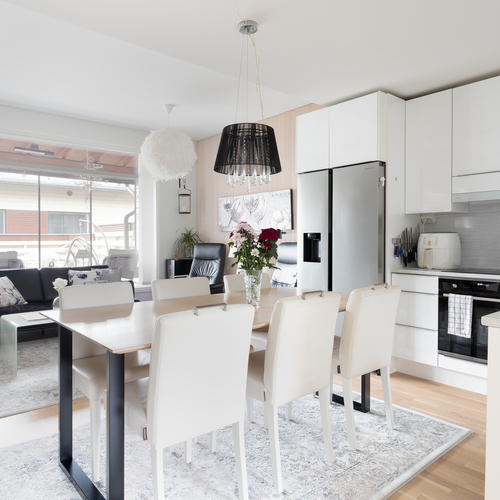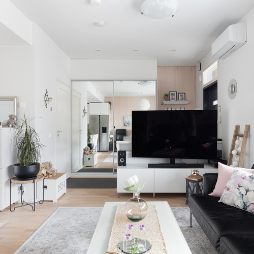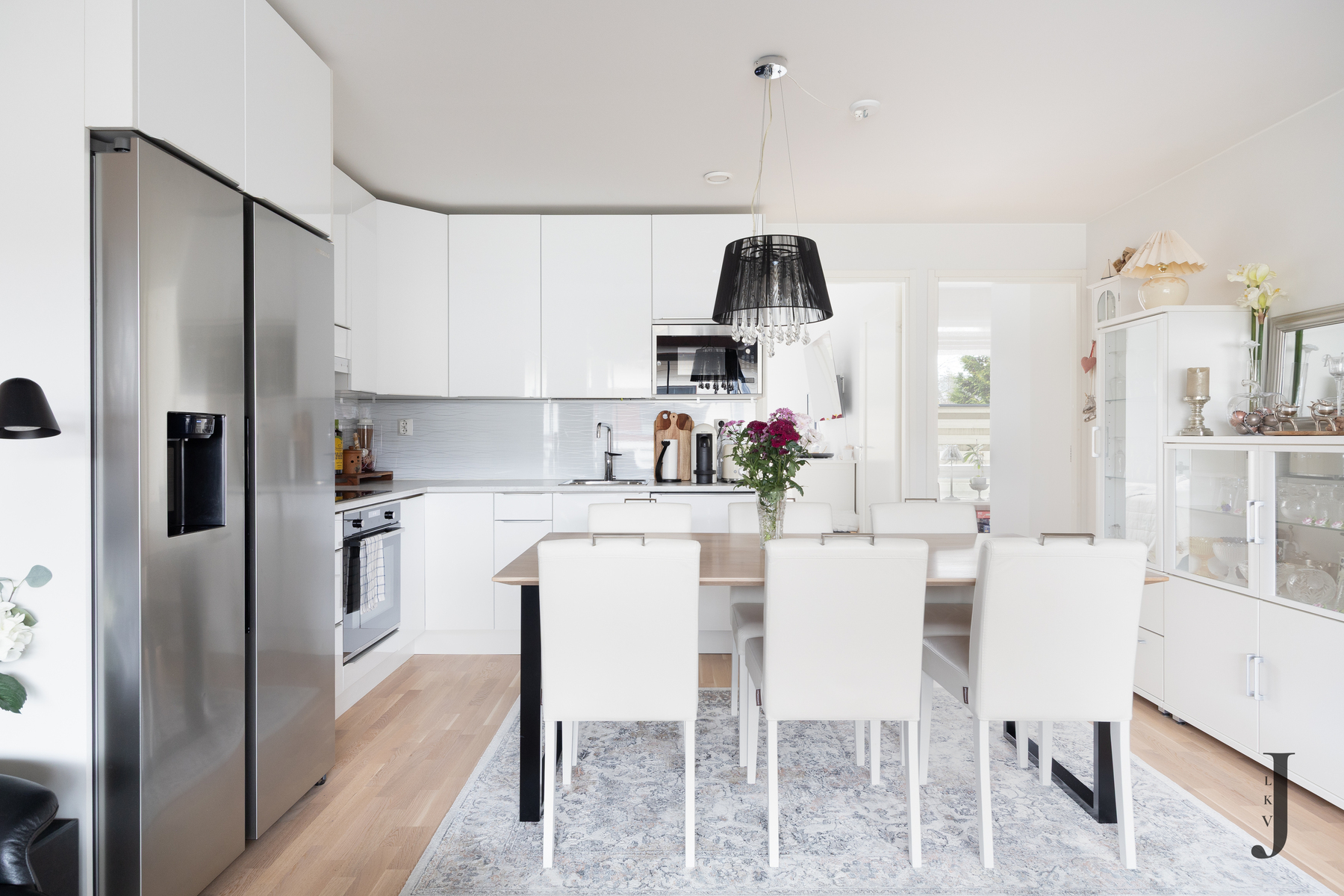 Asunnon avokeittiö luo keskipisteen arjen askareille ja perheen yhteisille hetkille. Induktioliedestä ja tilavasta side by side -jääkaappipakastimesta löytyvät kaikki tarvittavat välineet ruoan laittamiseen. Vaaleat parkettilattiat luovat lämpöä koko kotiin, ja olohuoneen tehosteseinä tuo persoonallista tyyliä sisustukseen.