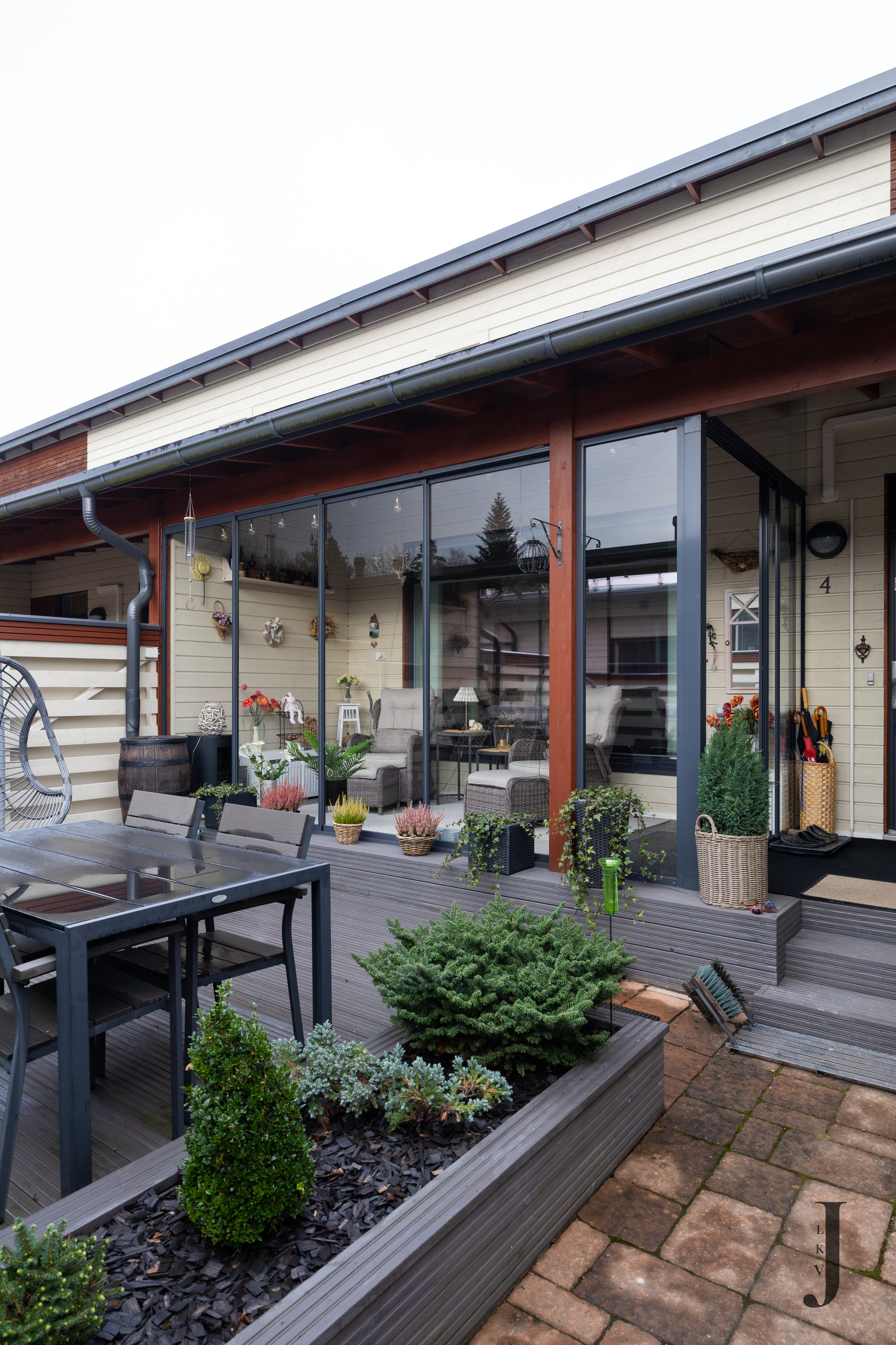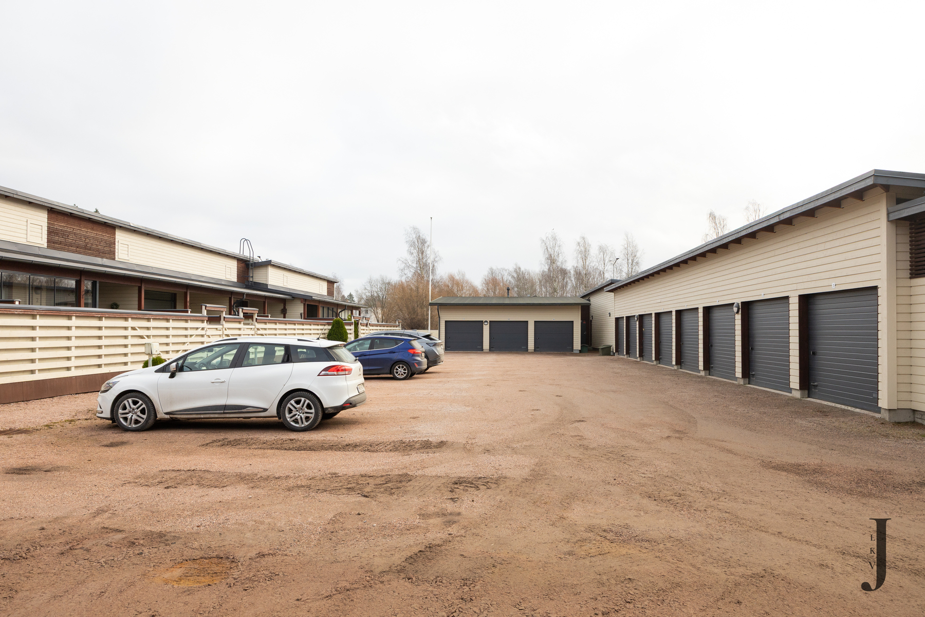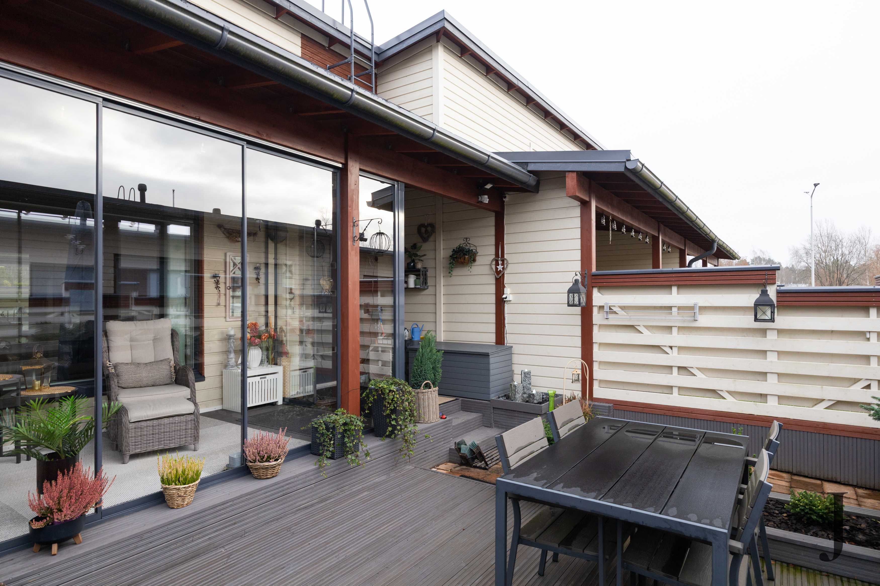Erityisen viehättävä on oma aidattu piha koristavan suihkulähteen kanssa. Lasitettu terassi lämmittäjineen ja screenverhoineen tarjoaa suojaisan oleskelutilan sääolosuhteista riippumatta. Kiinteistössä on maalämpö, ja pihapaikka sähkötolpalla kuuluu asuntoon.