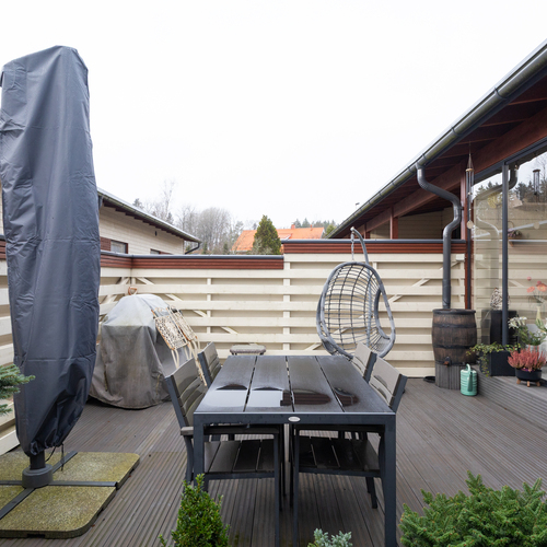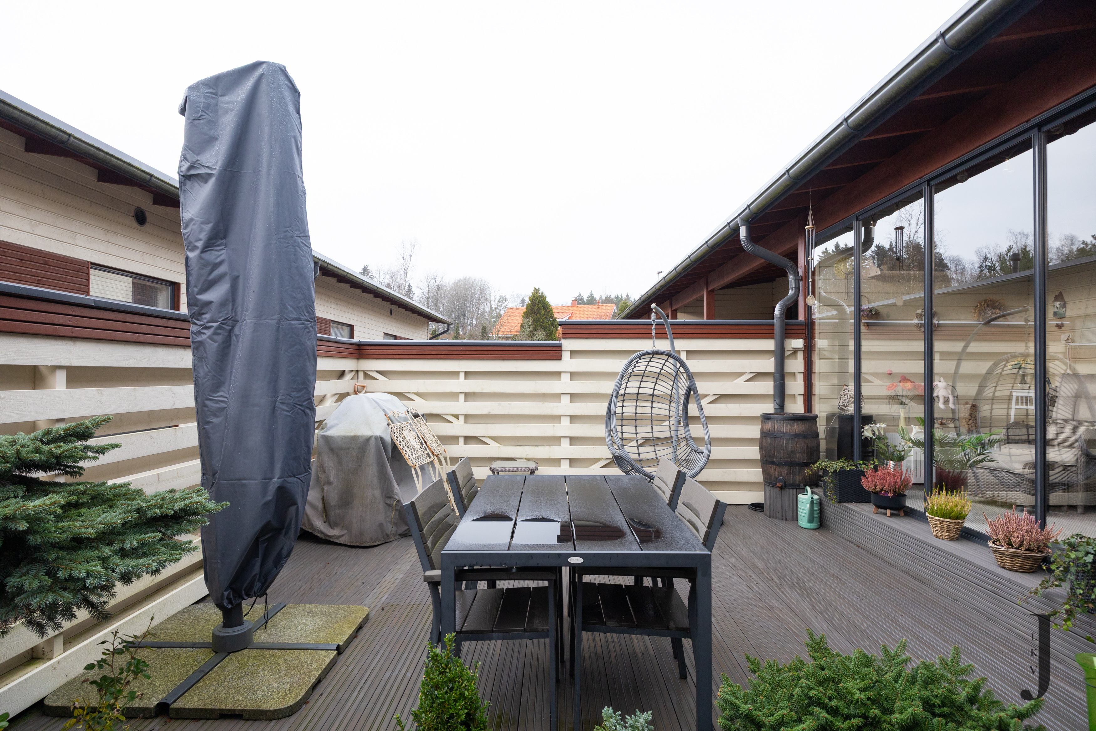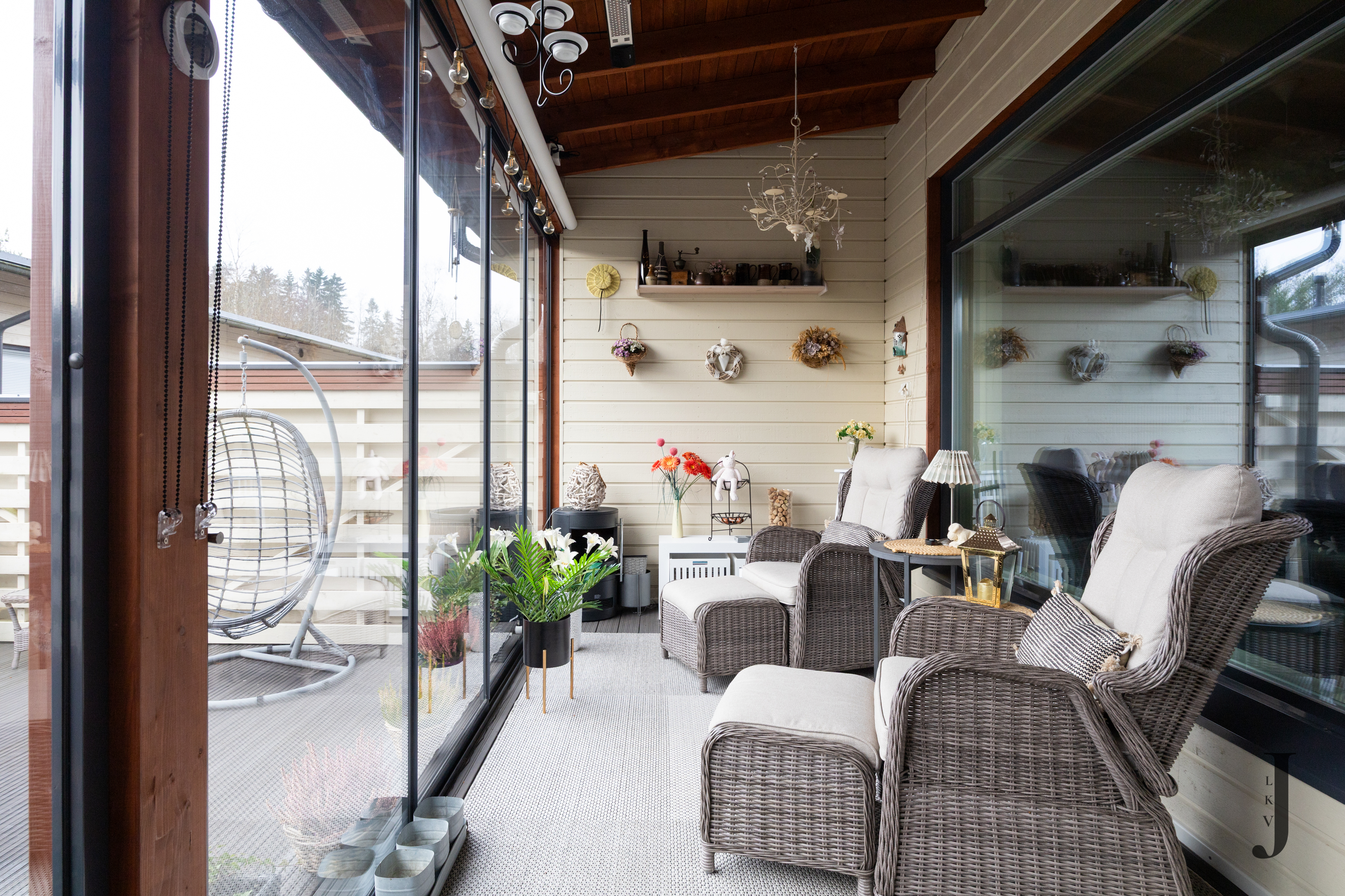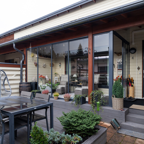 Erityisen viehättävä on oma aidattu piha koristavan suihkulähteen kanssa. Lasitettu terassi lämmittäjineen ja screenverhoineen tarjoaa suojaisan oleskelutilan sääolosuhteista riippumatta. Kiinteistössä on maalämpö, ja pihapaikka sähkötolpalla kuuluu asuntoon.