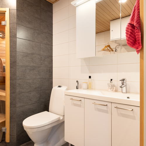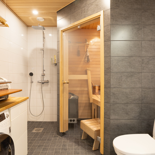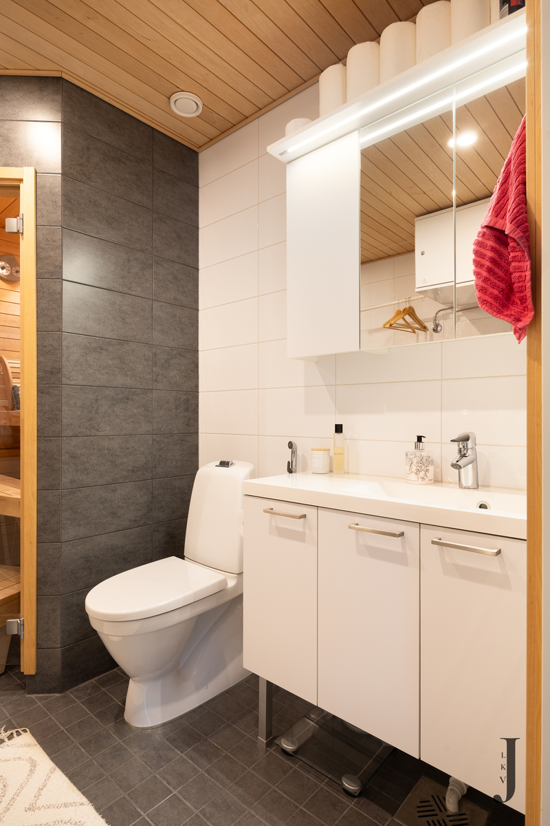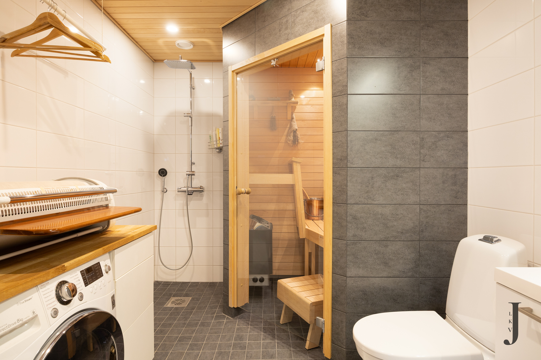 Oma sauna haapalauteilla tarjoaa rentoutumispaikan arjen pyörityksessä. Kylpyhuoneessa moderni sadesuihku ja käytännölliset säilytysratkaisut tekevät arjesta sujuvaa. Viilentävä ilmalämpöpumppu pitää huolen mukavasta sisä lämpötilasta kesän helteillä.