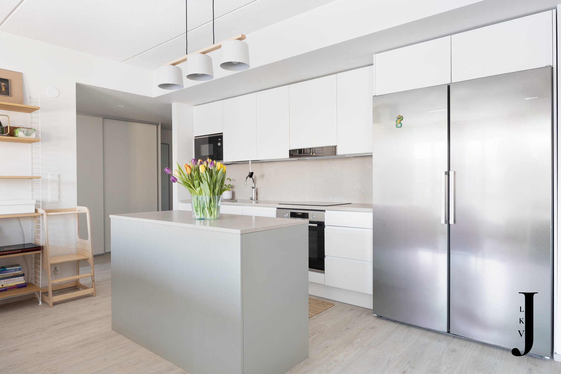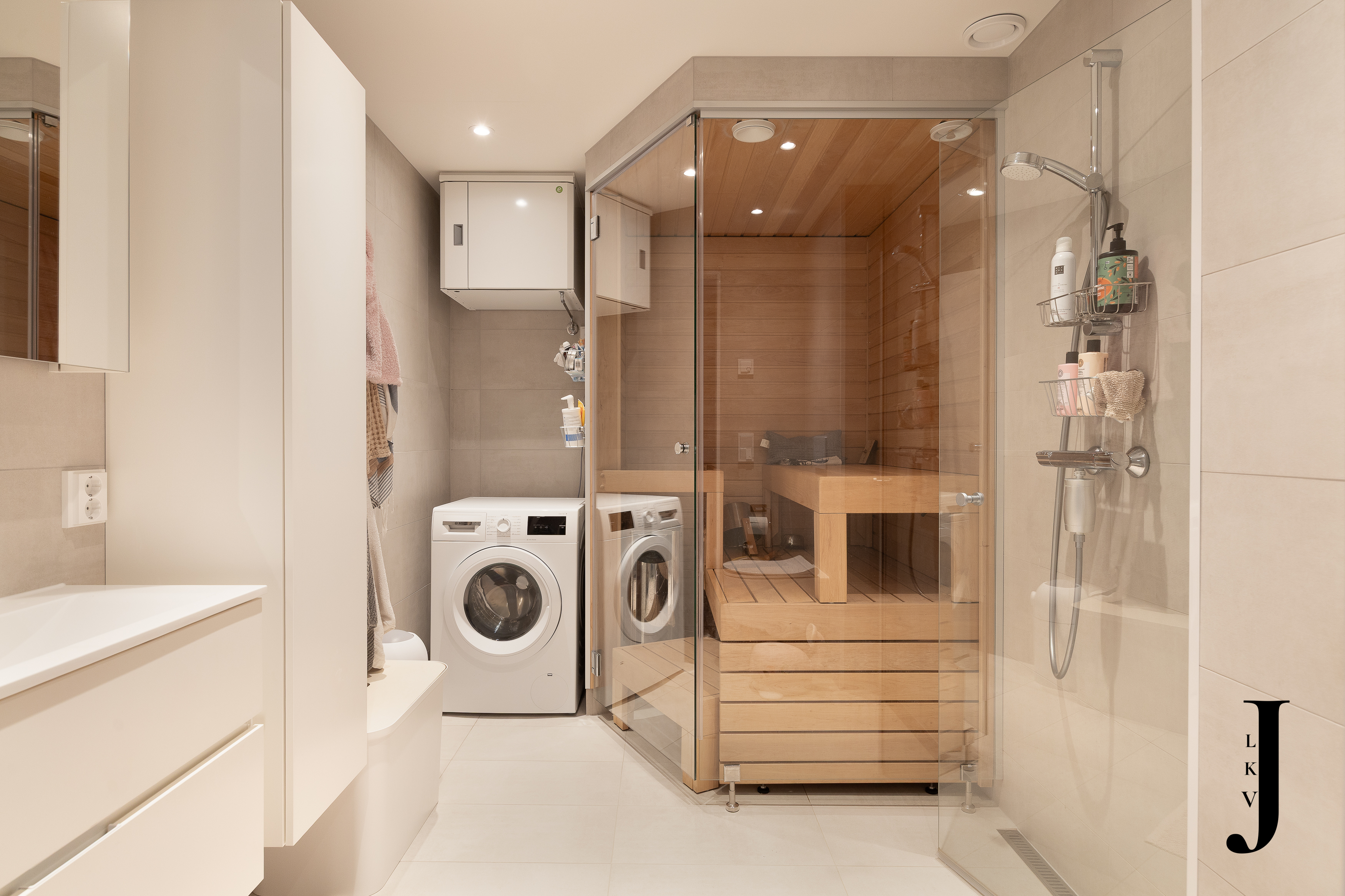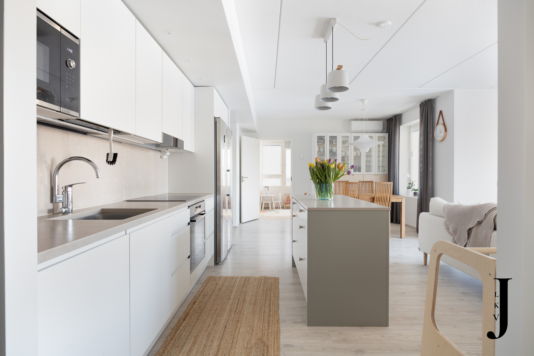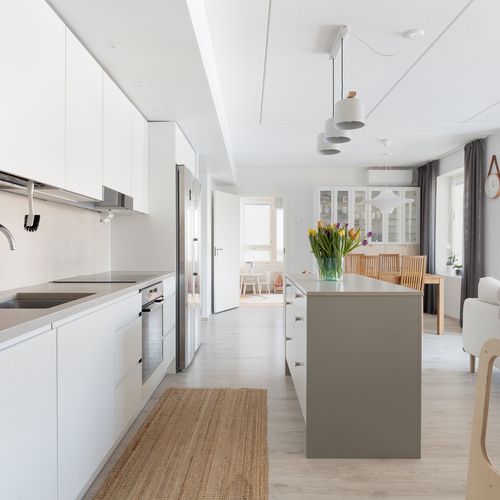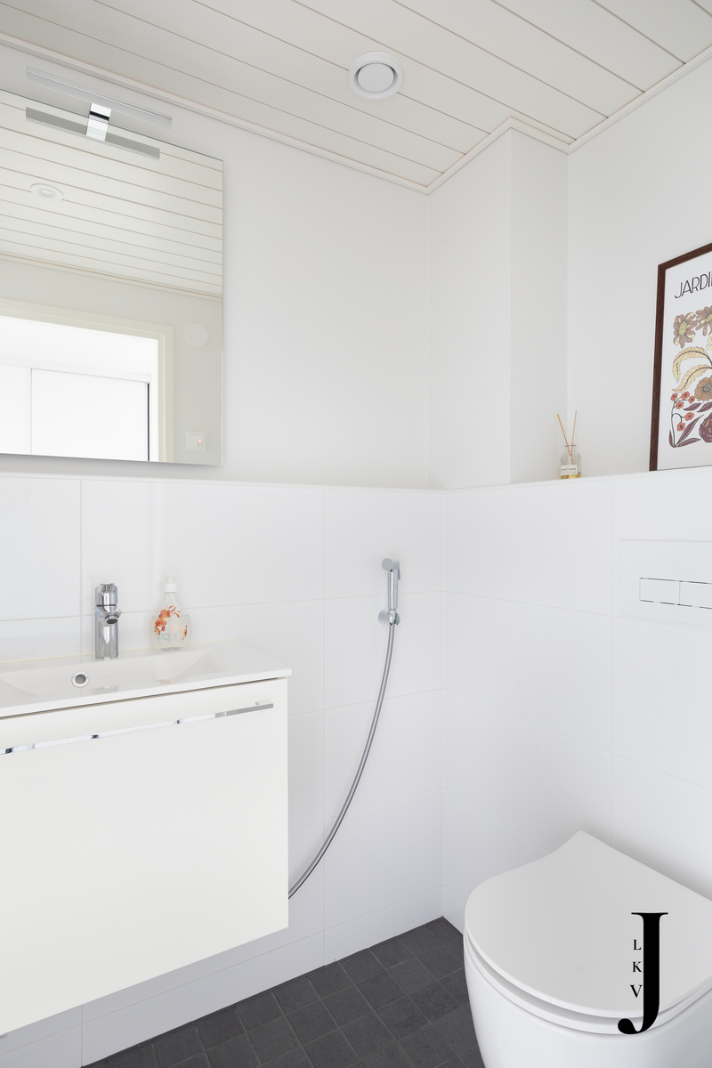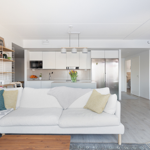 Asunnon sydämenä toimii tyylikäs ja laadukkaasti suunniteltu Puustellin Dyyni-malliston keittiö, jossa yhdistyvät käytännöllisyys ja estetiikka. Kvartsitasot, integroidut kodinkoneet ja lisätilaa tuova saareke varmistavat, että keittiö miellyttää myös vaativampaa kotikokkia. Modernissa ja viimeistellyssä kylpyhuoneessa voit hemmotella itseäsi arjen keskellä, ja erillinen wc tuo lisää sujuvuutta arkeen. Kodin yhtenäinen laminaattilattia sitoo tilat kauniisti yhteen ja korostaa asunnon ajattoman eleganttia tunnelmaa.