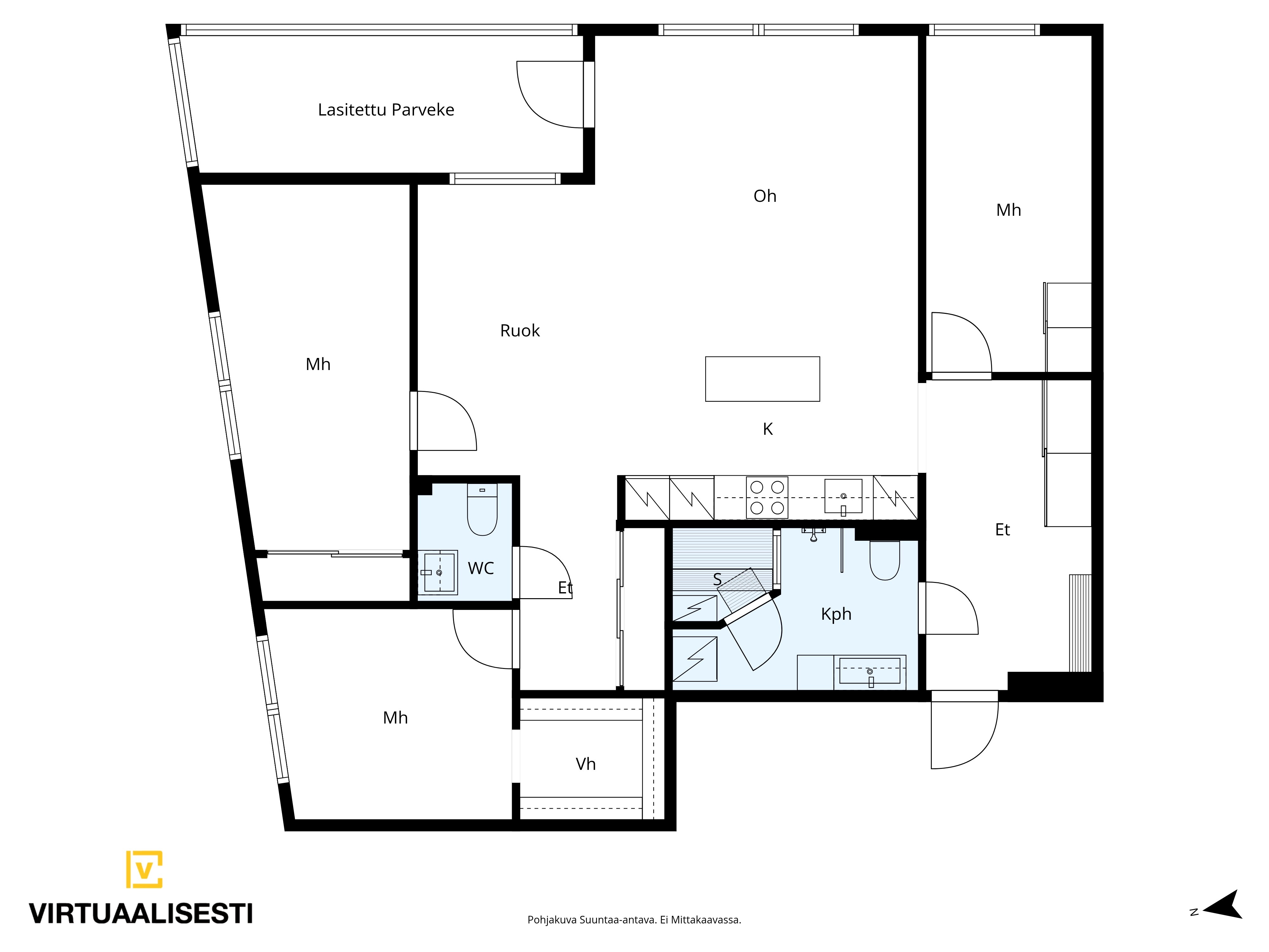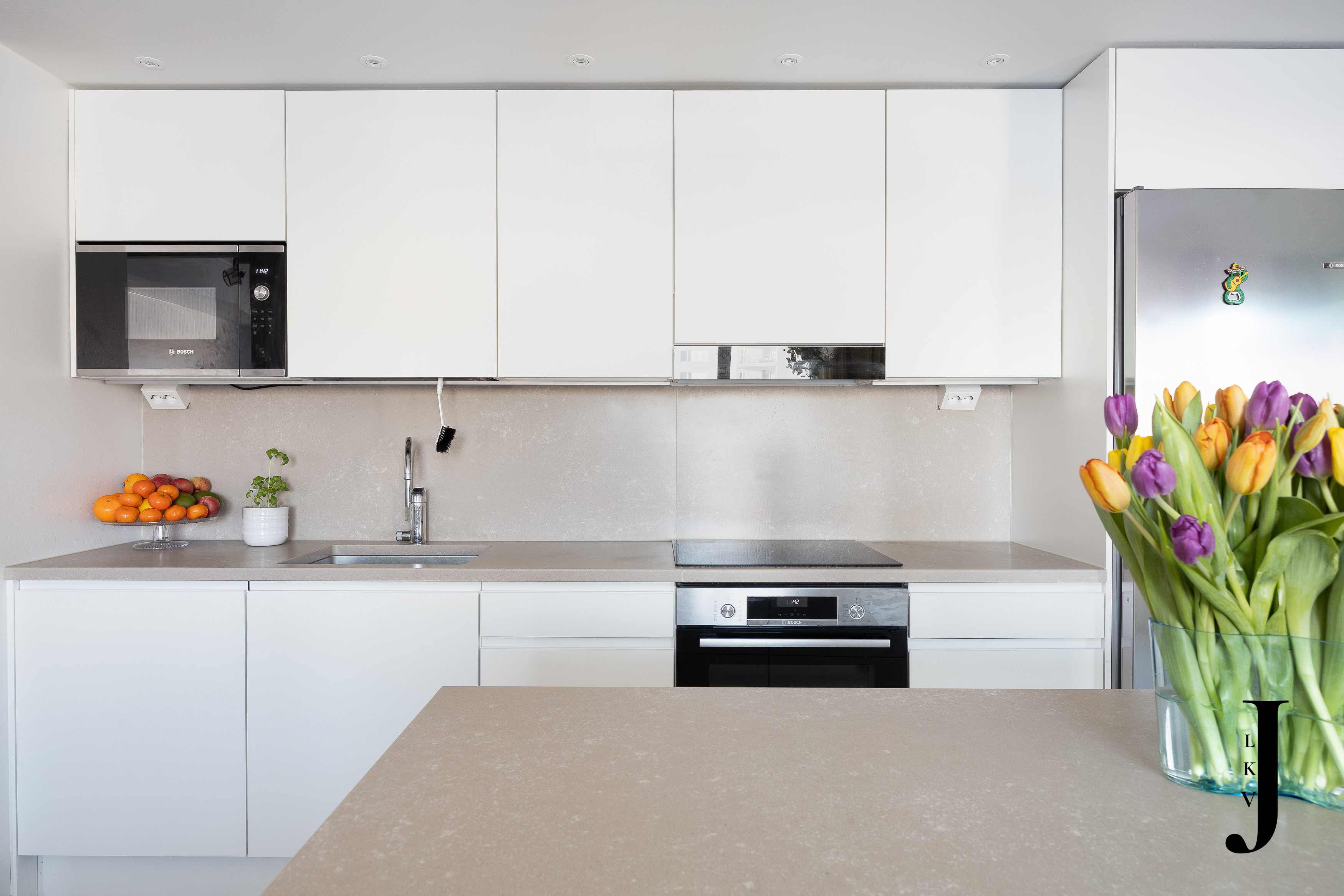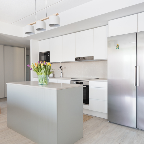 Varusteet: jääkaappi, pakastin, integroidut kodinkoneet, mikroaaltouuni, liesituuletin, induktioliesi
