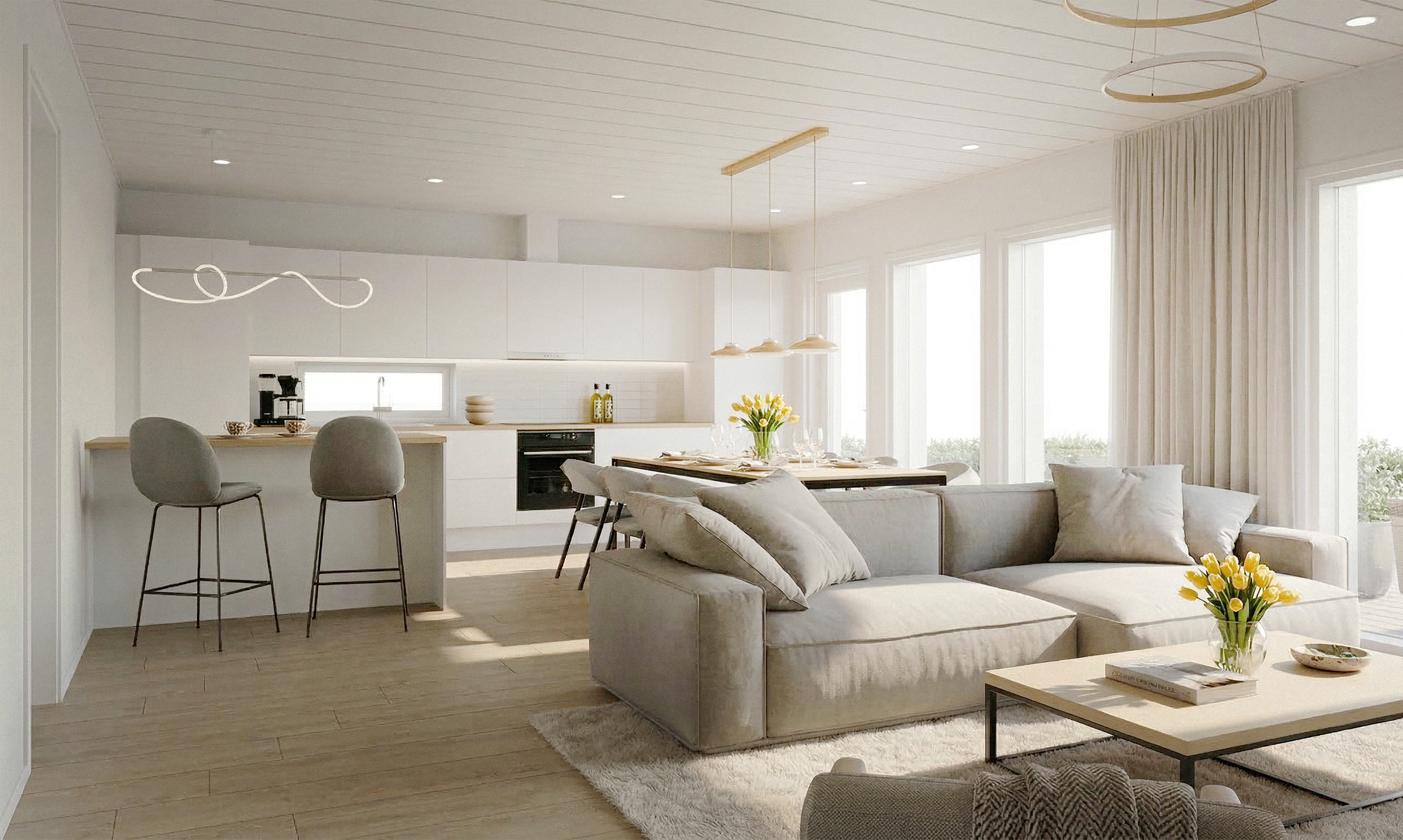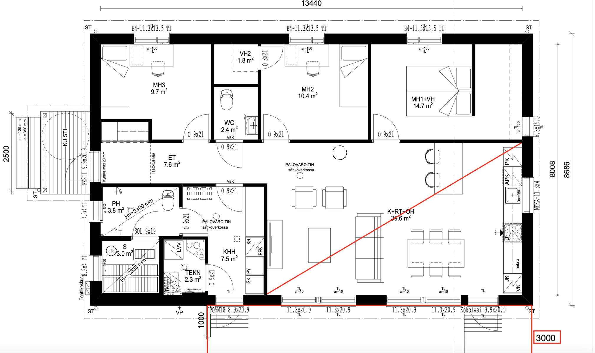 Varusteet: jääkaappi, pakastin, induktioliesi, erillisuuni, liesituuletin hormilla, mikroaaltouuni, astianpesukone, astianpesukoneliitäntä, integroidut kodinkoneet, kiinteät valaisimet