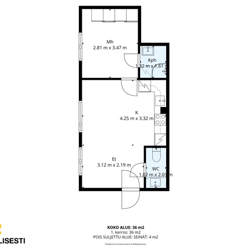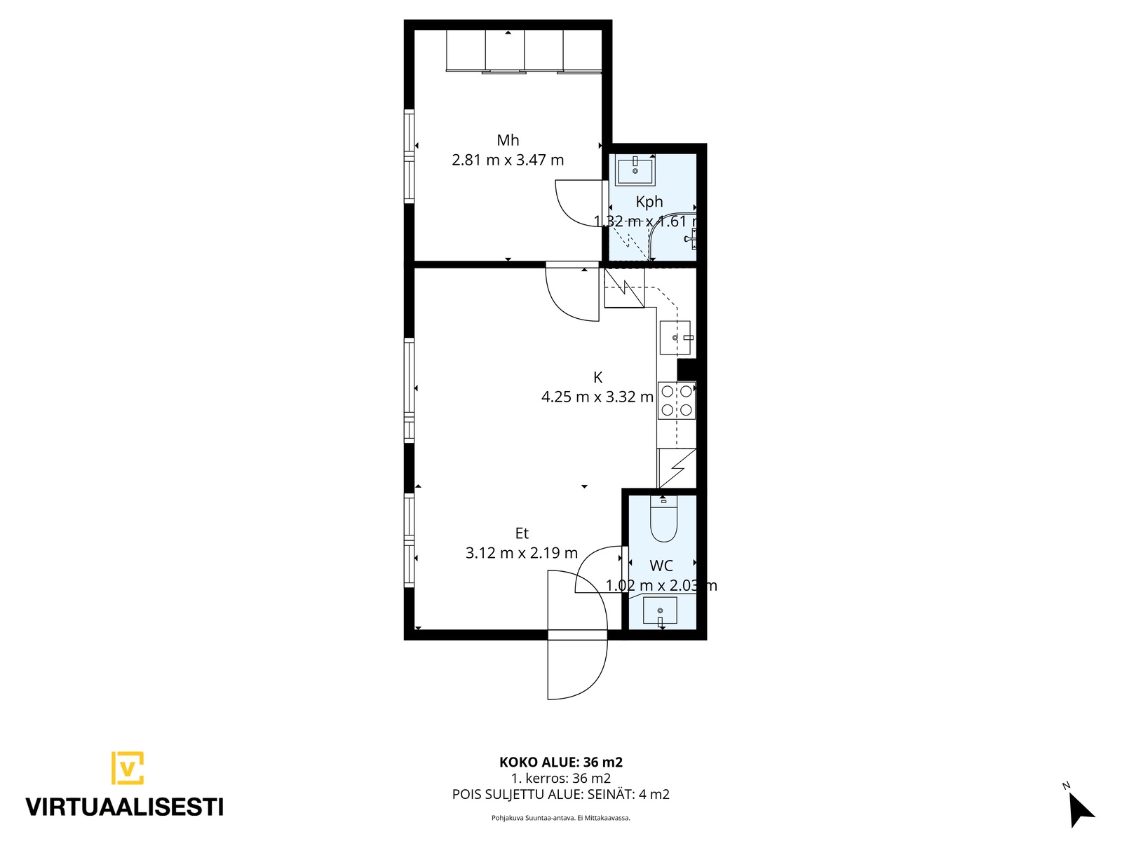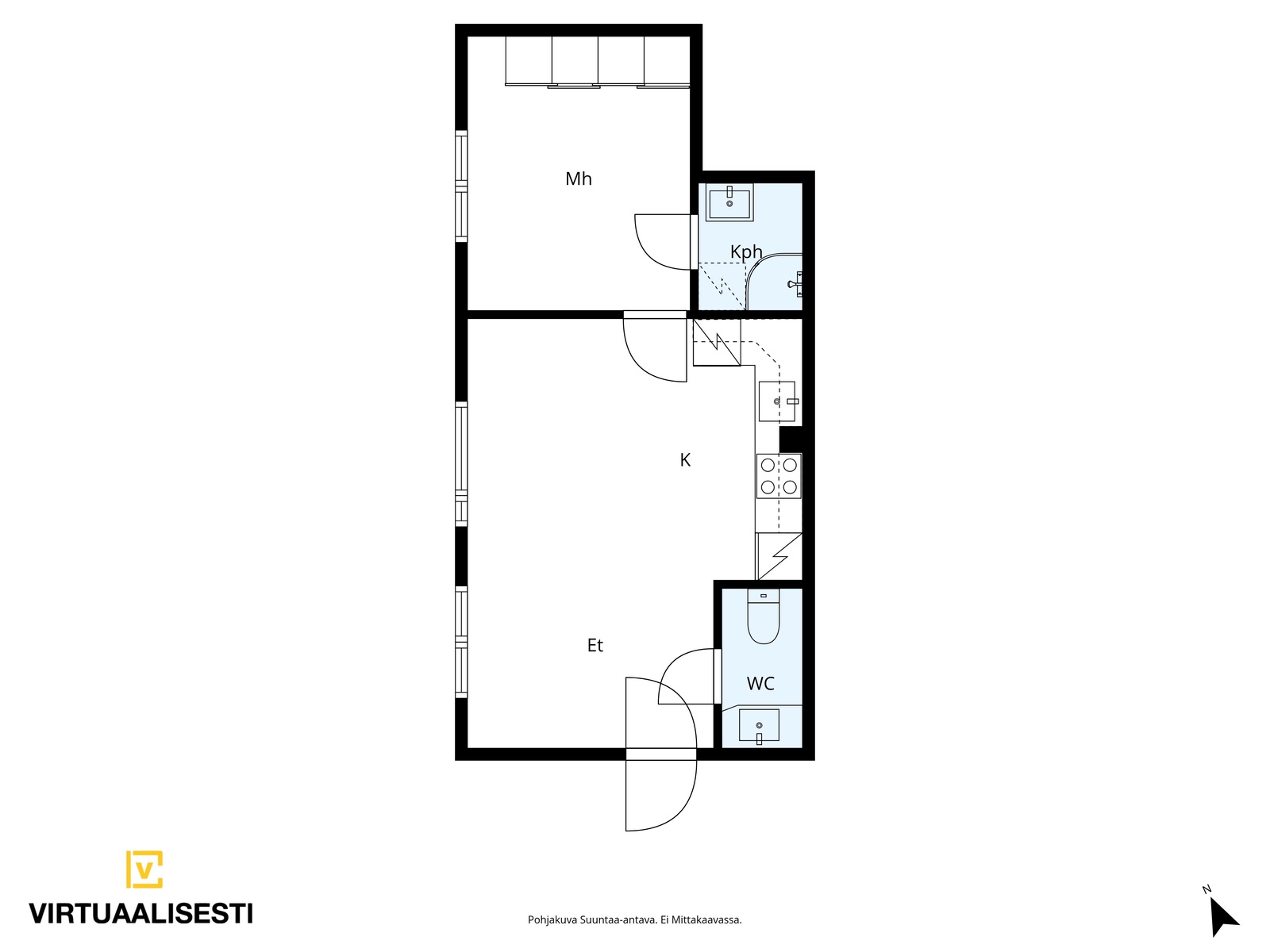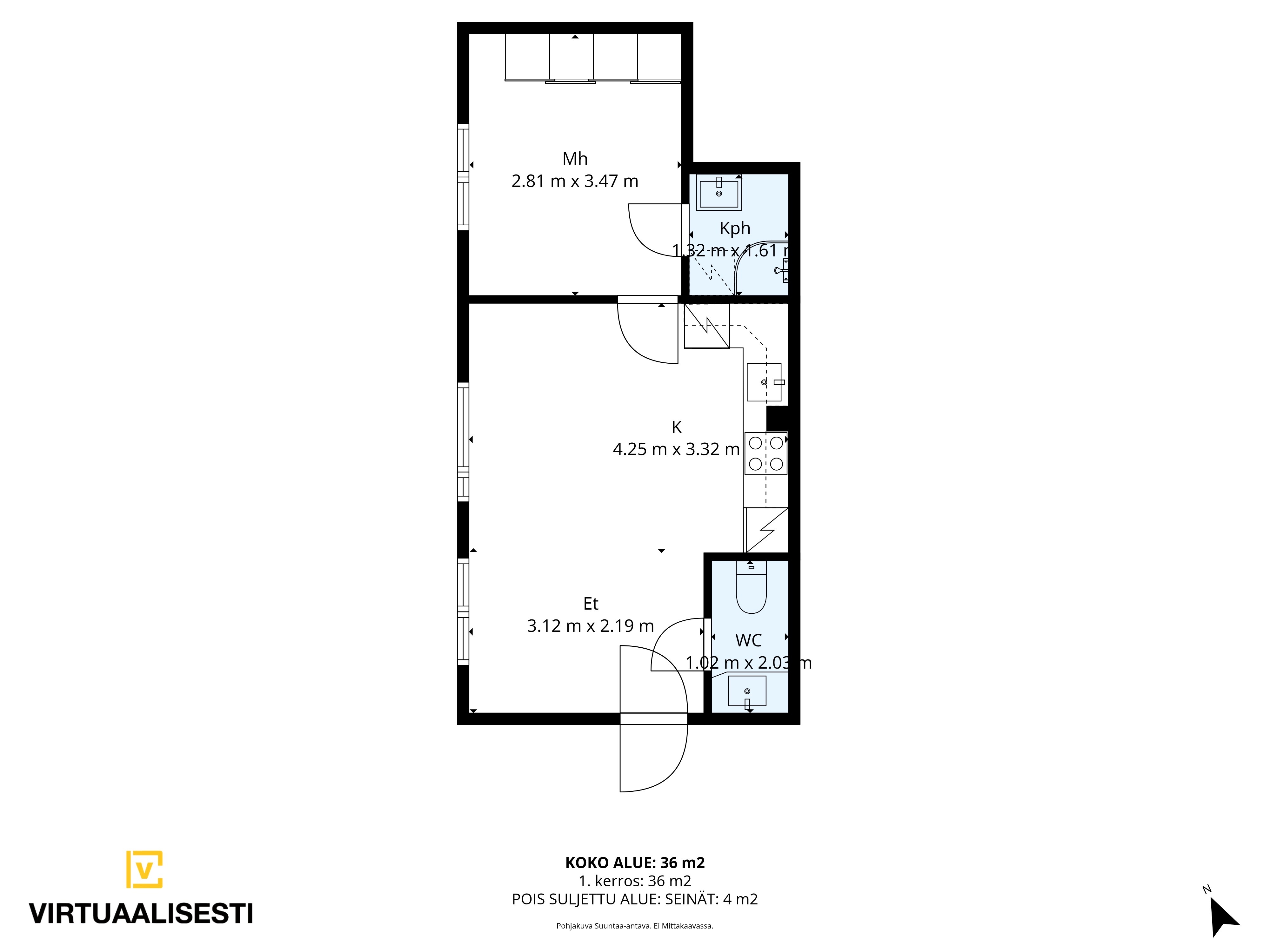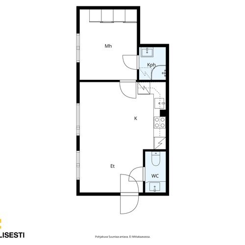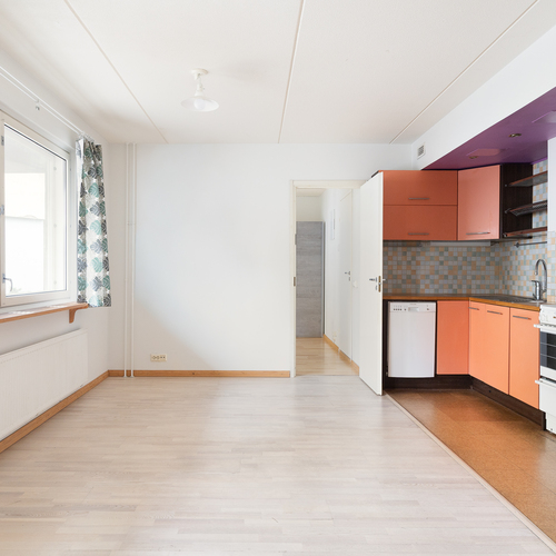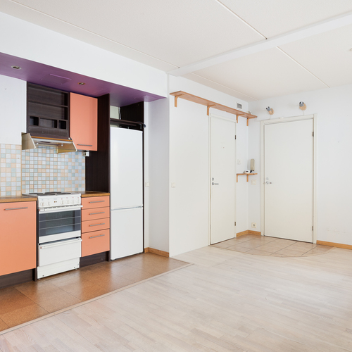 Tämä iso 36 m² yksiö tarjoaa toimivan pohjaratkaisun avokeittiöllä / olohuoneella, makuuhuoneella sekä kylpyhuoneella ja erillisellä wc:llä. Lattiamateriaalit ovat parkettia oleskelutiloissa ja laattaa märkätiloissa. Kylpyhuone on juuri remontotu.