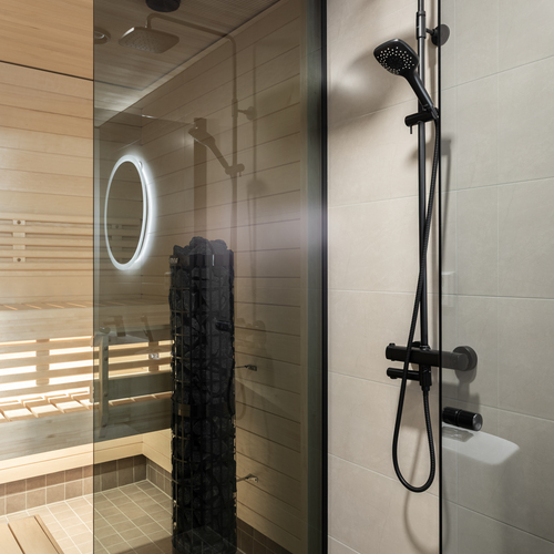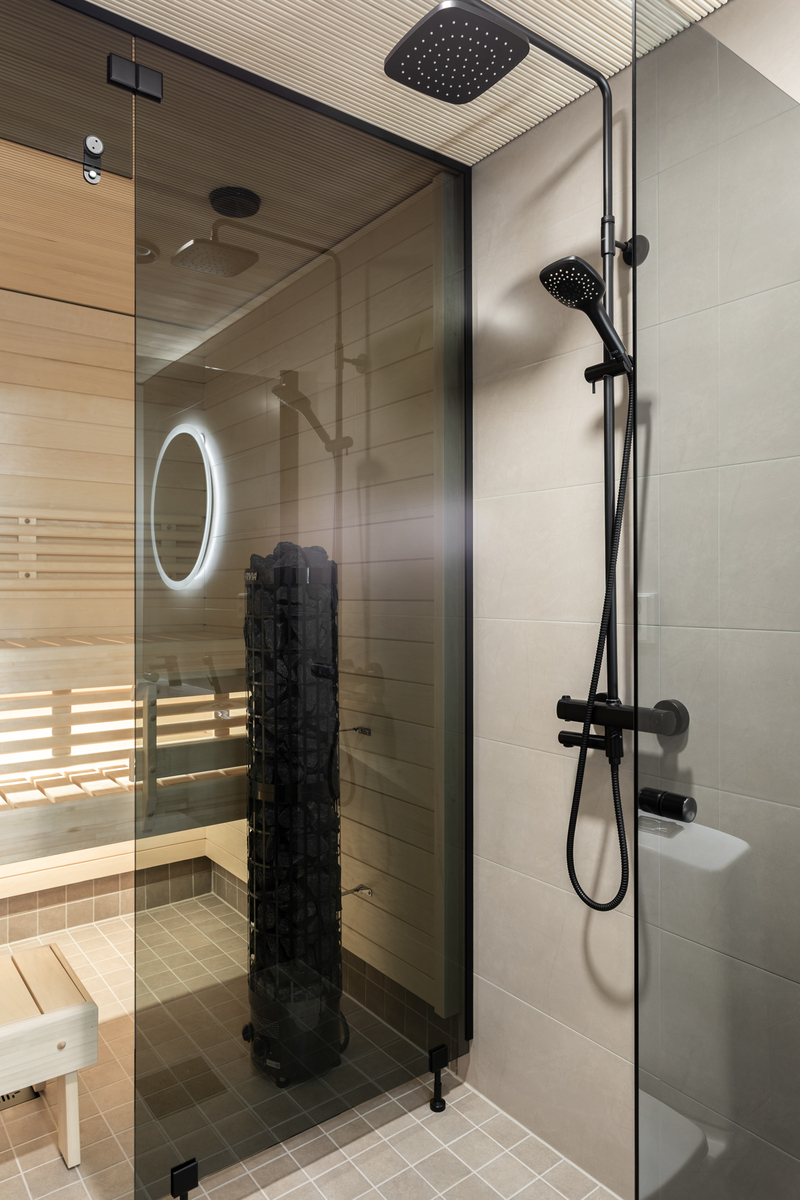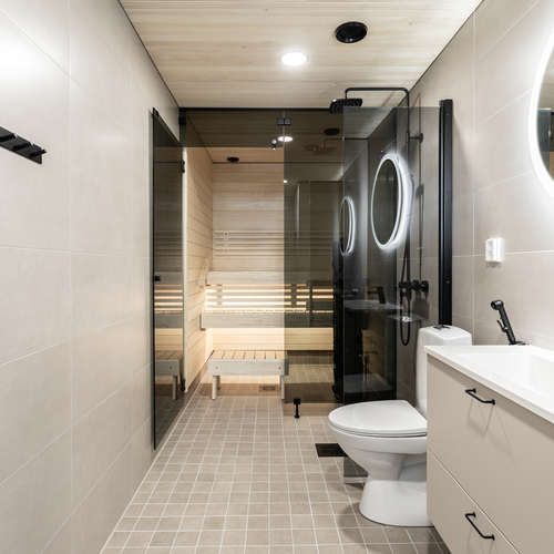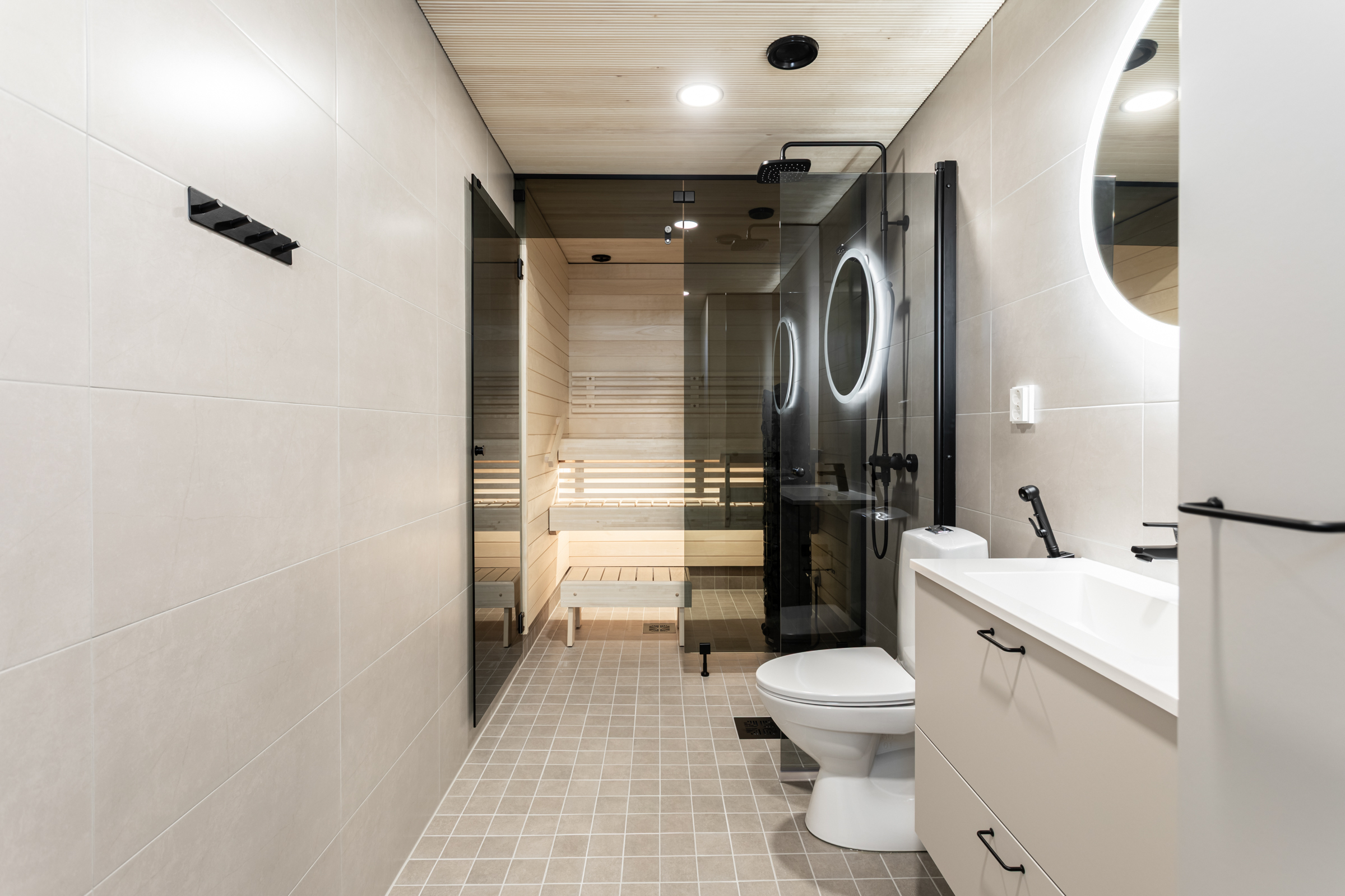 Varusteet: sähkökiuas, LED-valaistus, lattialämmitys