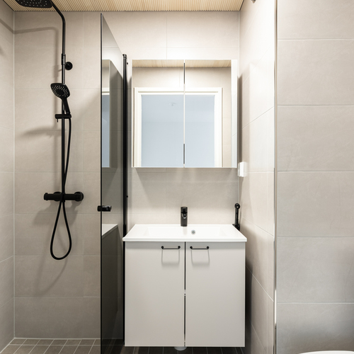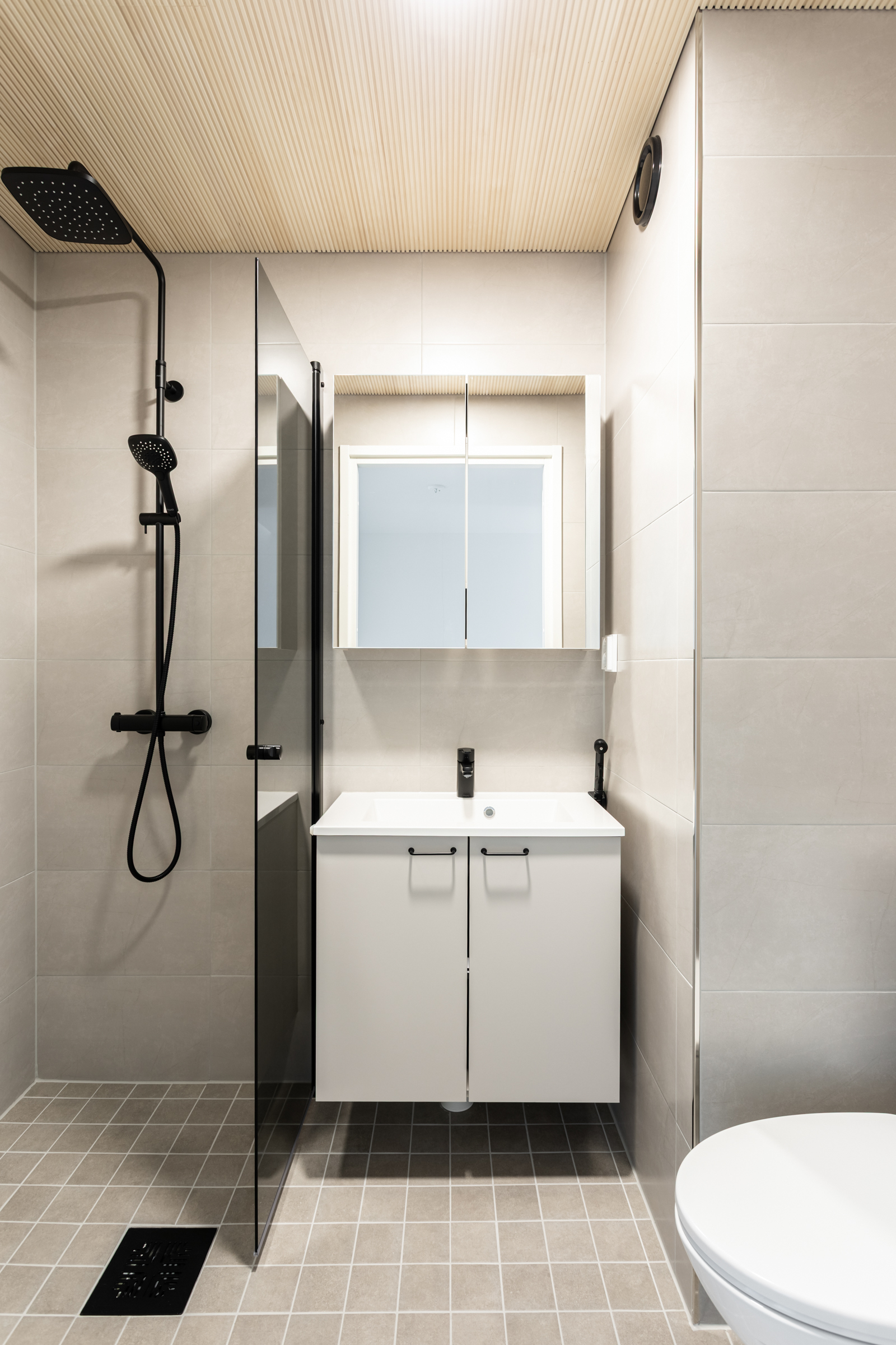 Varusteet: suihku, suihkuseinä, lattialämmitys, kiinteät valaisimet, pesukoneliitäntä, kylpyhuonekaapistot, allaskaappi, peilikaappi