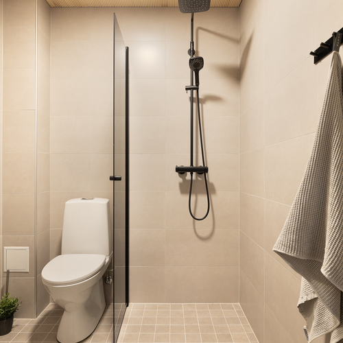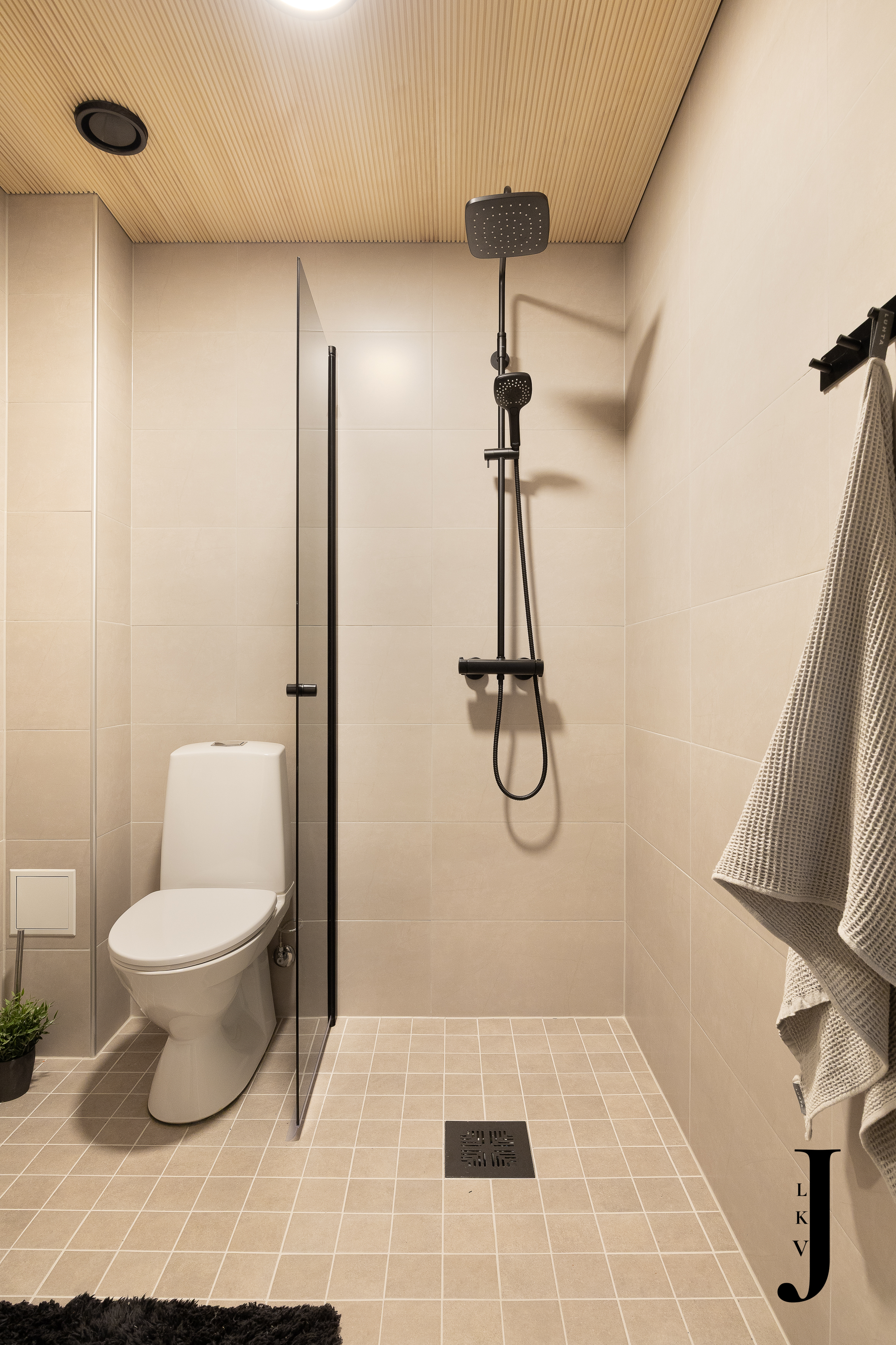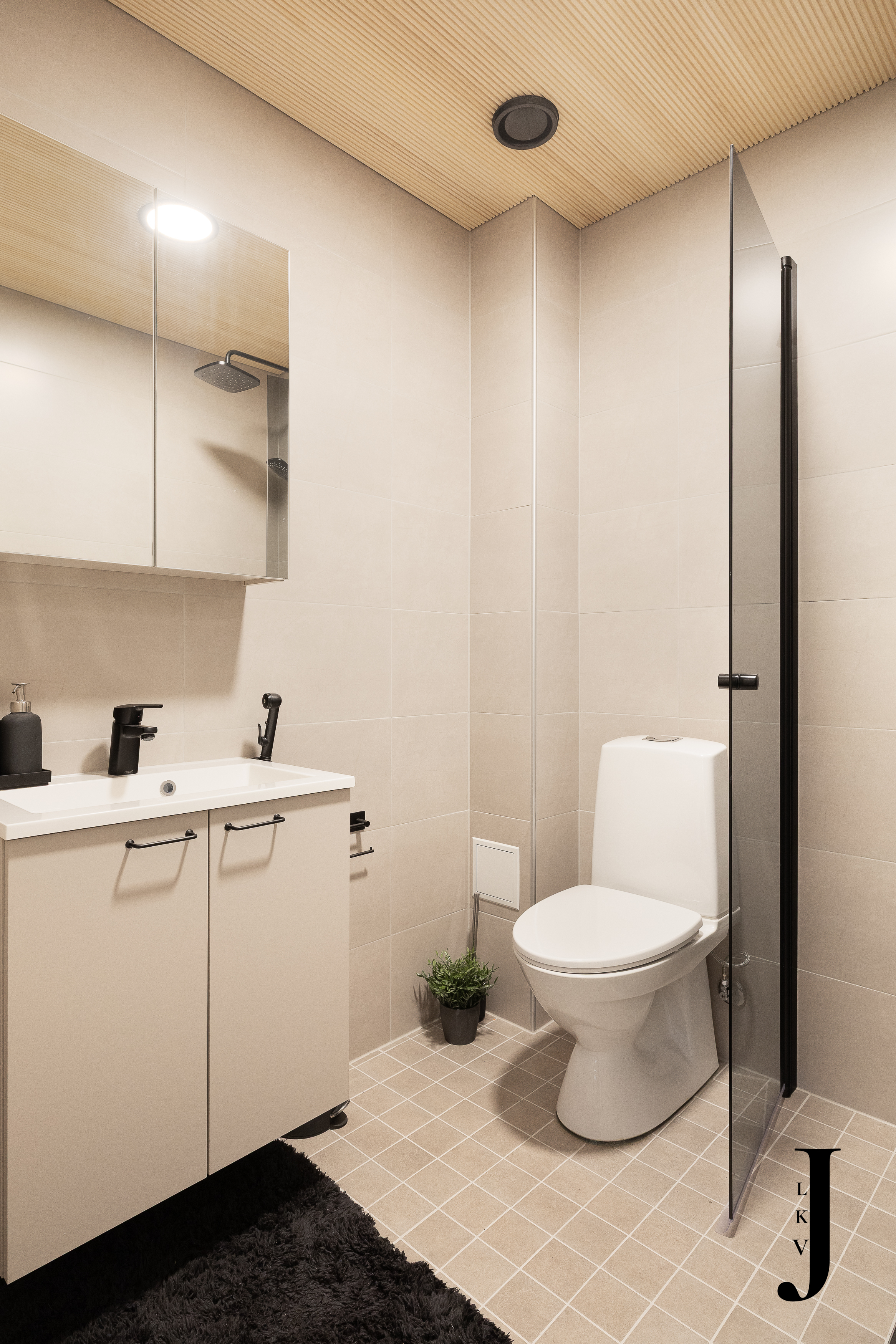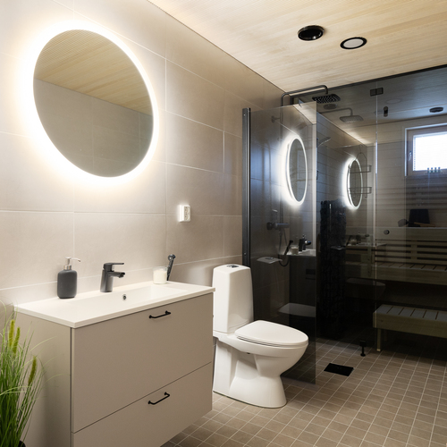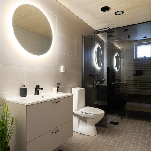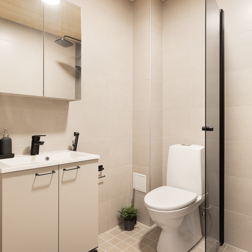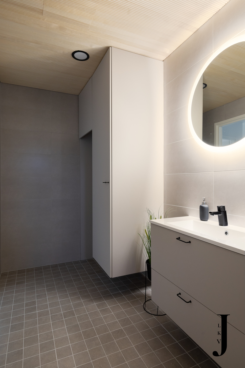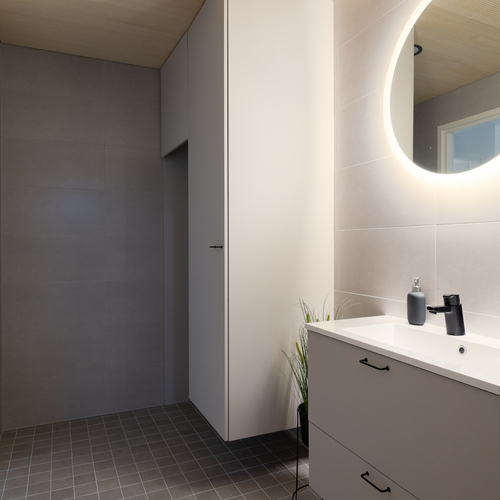 Varusteet: suihku, kiinteät valaisimet, kylpyhuonekaapistot, allaskaappi, pesukoneliitäntä, peilikaappi, suihkuseinä, lattialämmitys