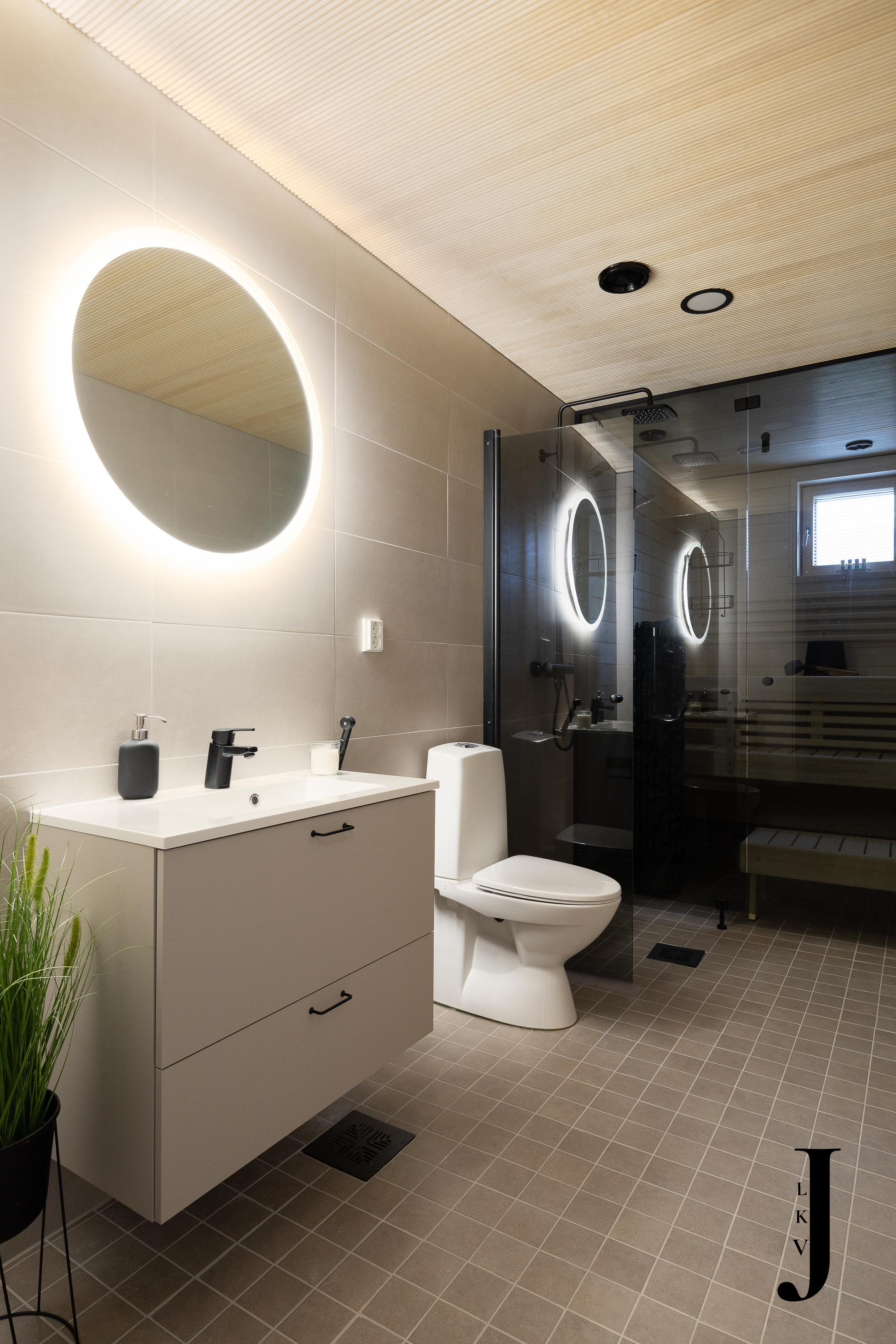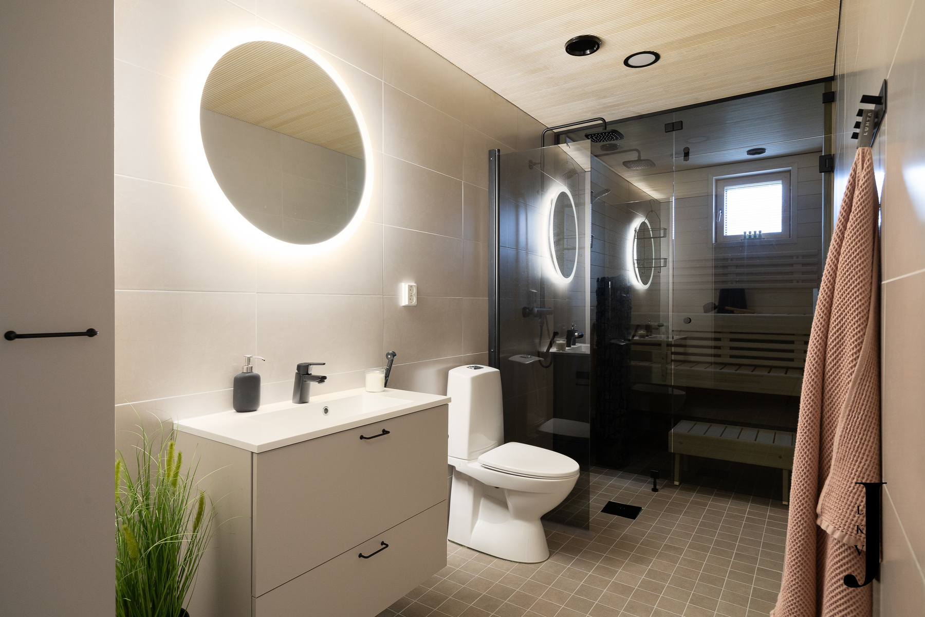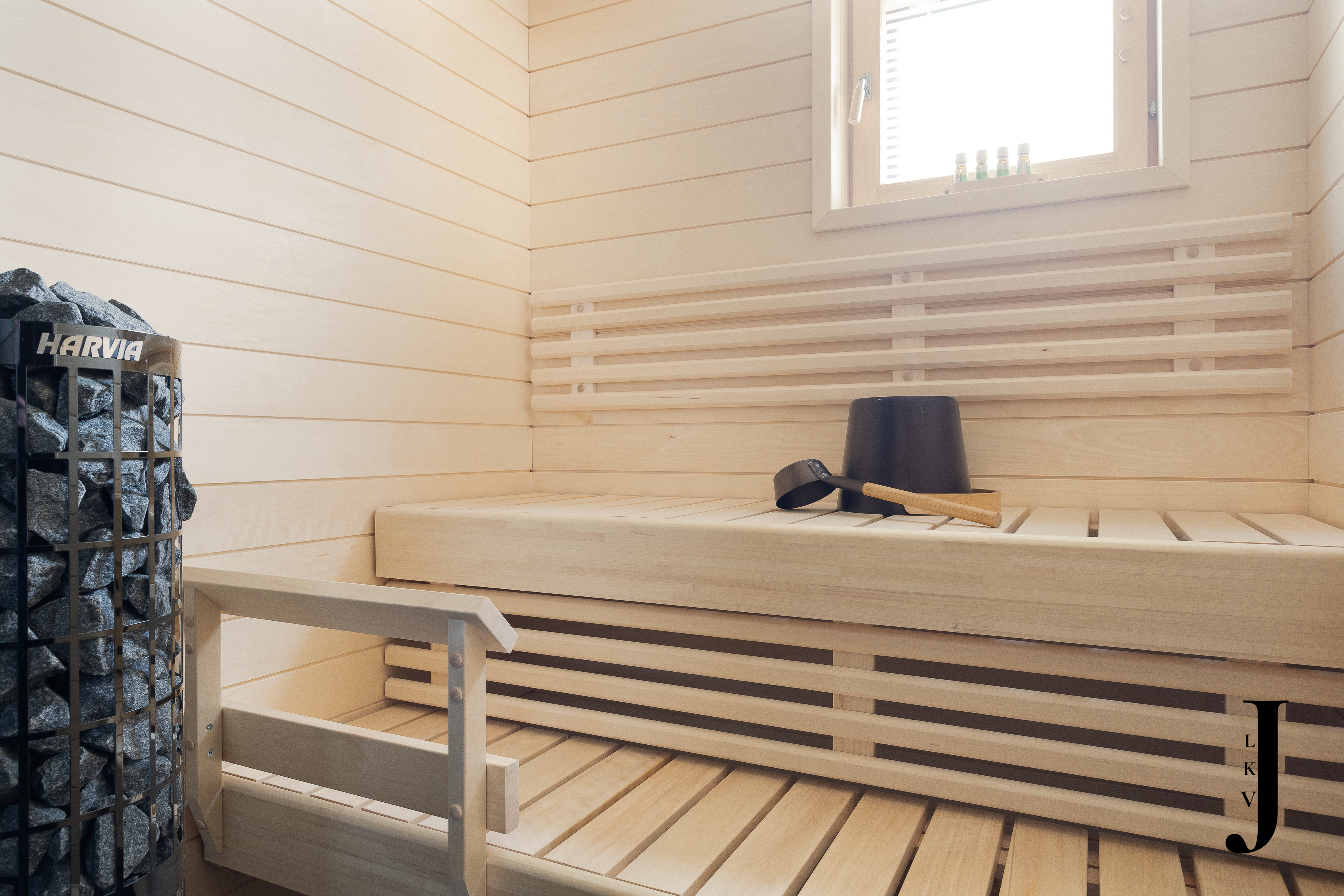 Varusteet: sähkökiuas, LED-valaistus, lattialämmitys