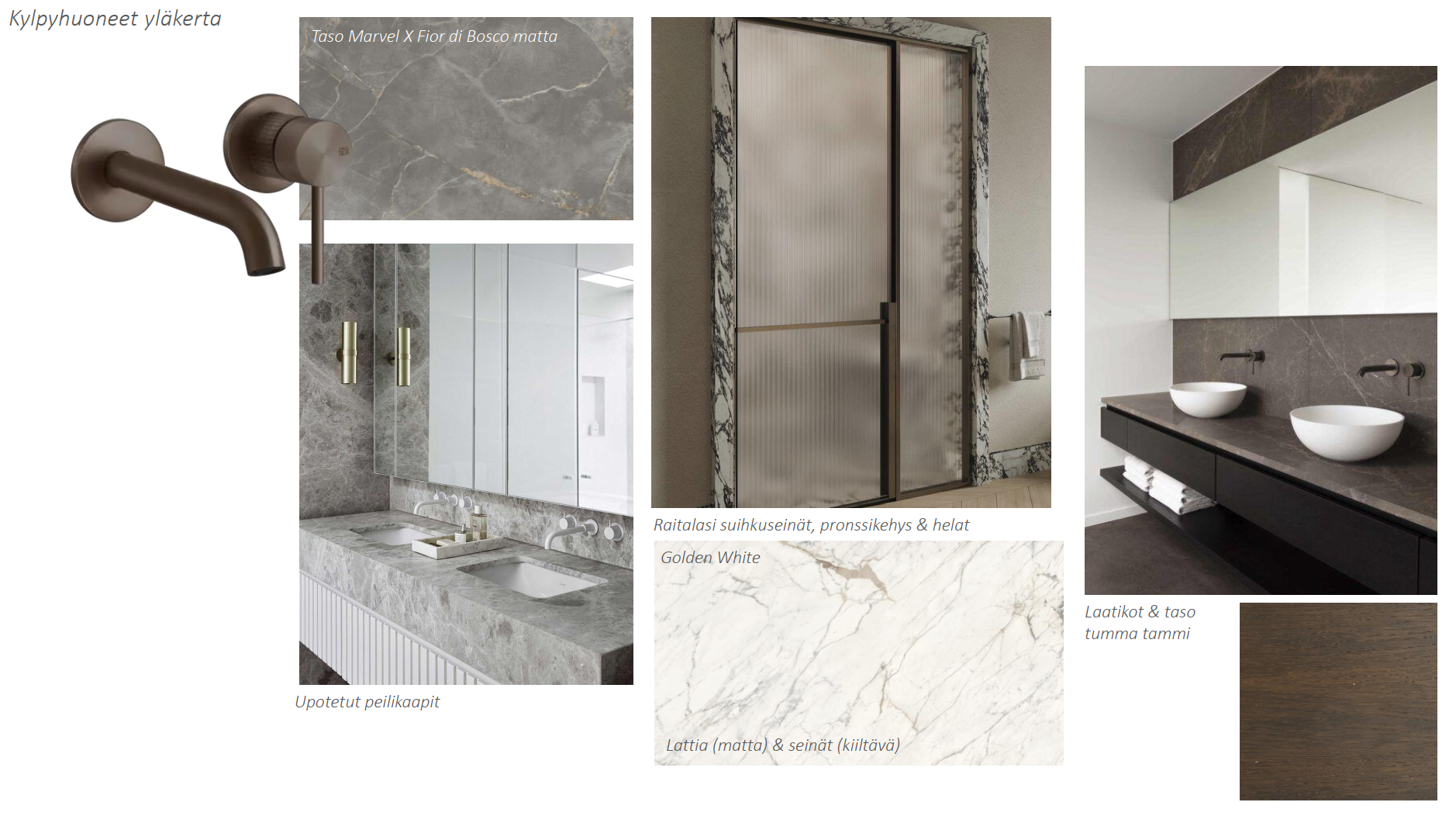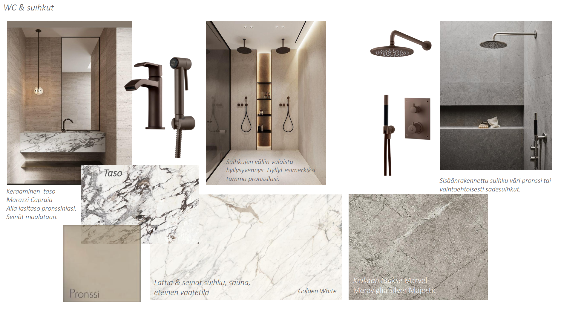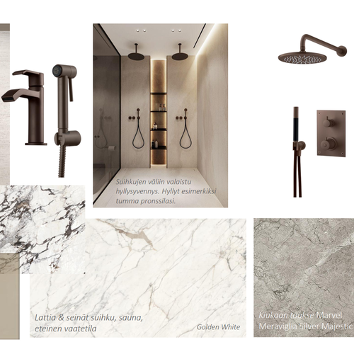 Varusteet: suihku, suihkuseinä, kaksi suihkua, lattialämmitys, kiinteät valaisimet, kylpyhuonekaapistot, peili