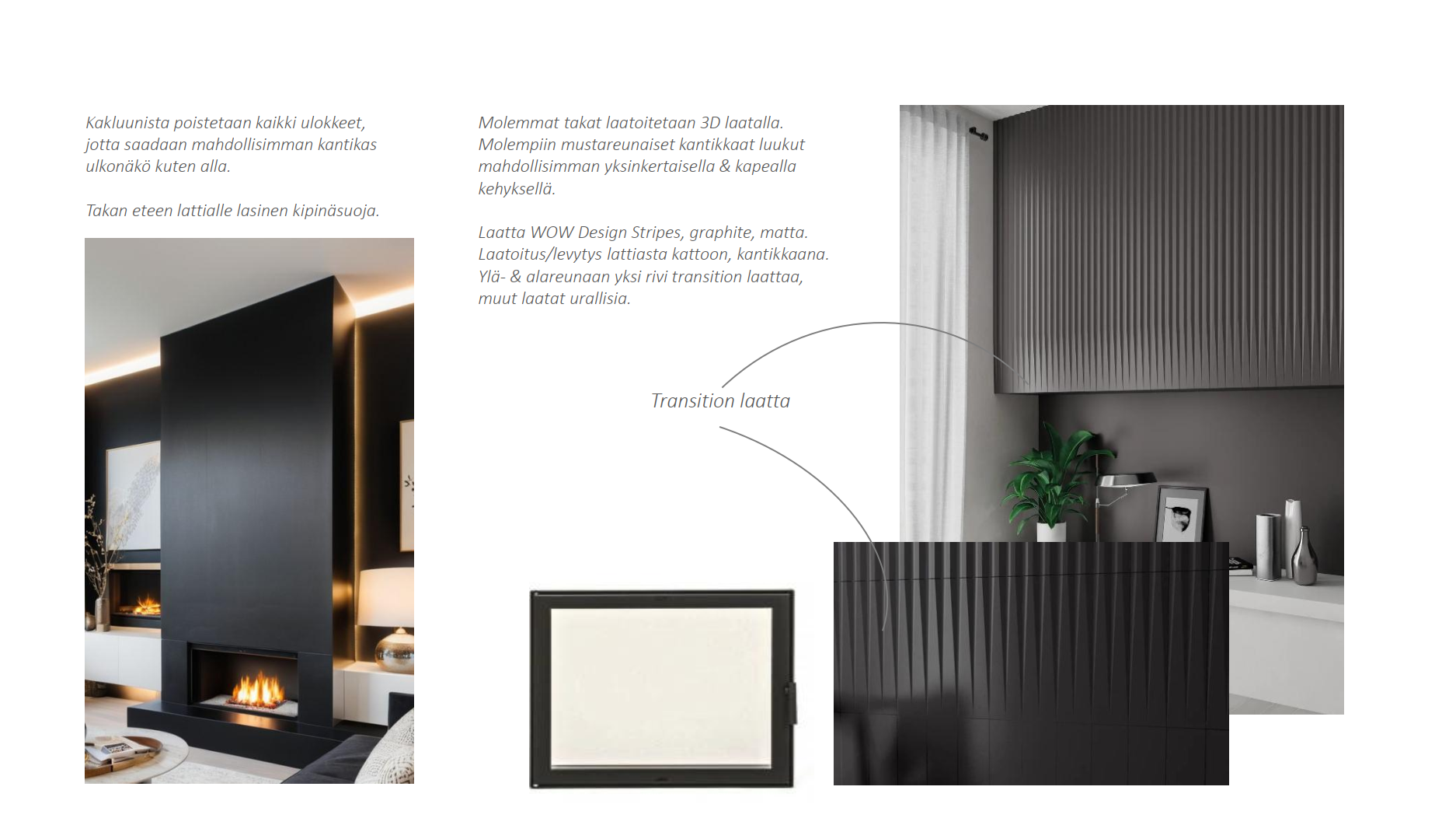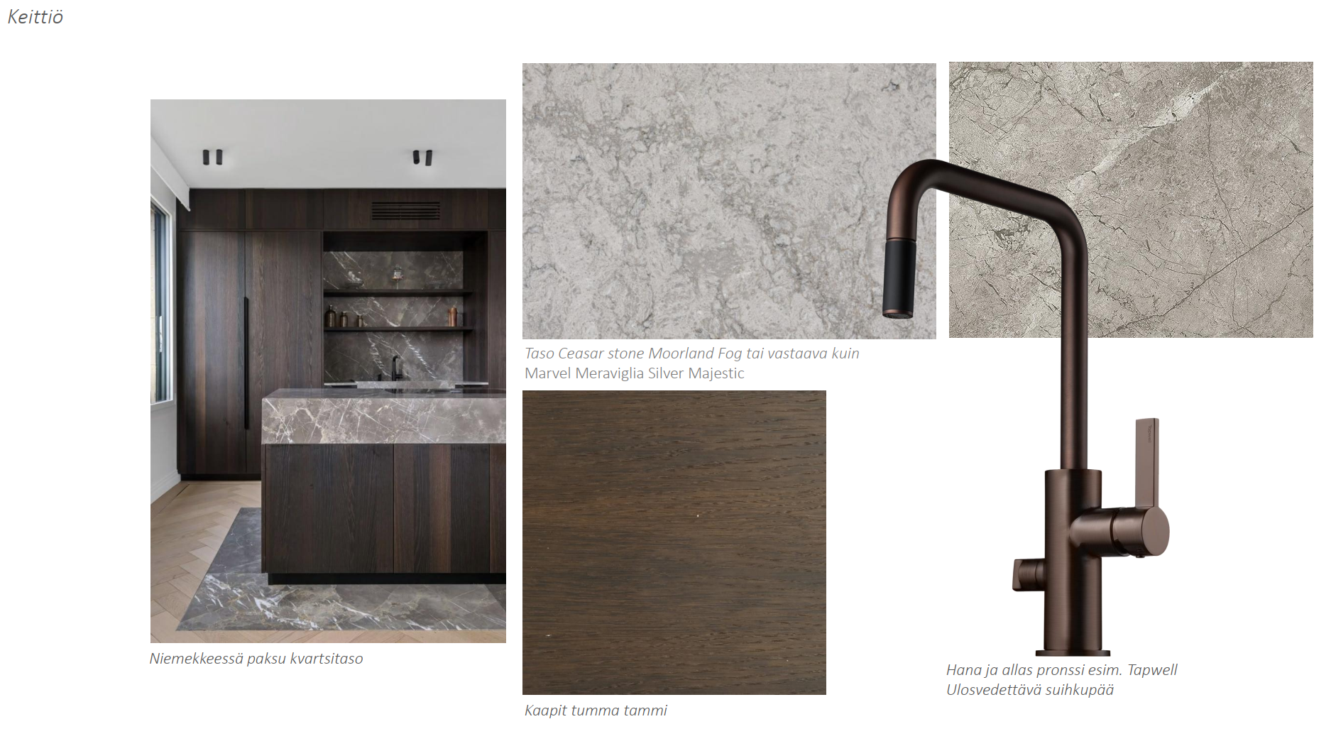 Kodin sydän löytyy keittiöstä, jossa kivimateriaalit yhdistyvät puuhun ja integroituihin kodinkoneisiin. Induktioliesi, erillinen uuni, astianpesukone ja jopa viinikaappi tekevät ruoanlaitosta nautintoa. Olohuoneessa varaavatakka luo tunnelmaa perheen yhteisille hetkille.