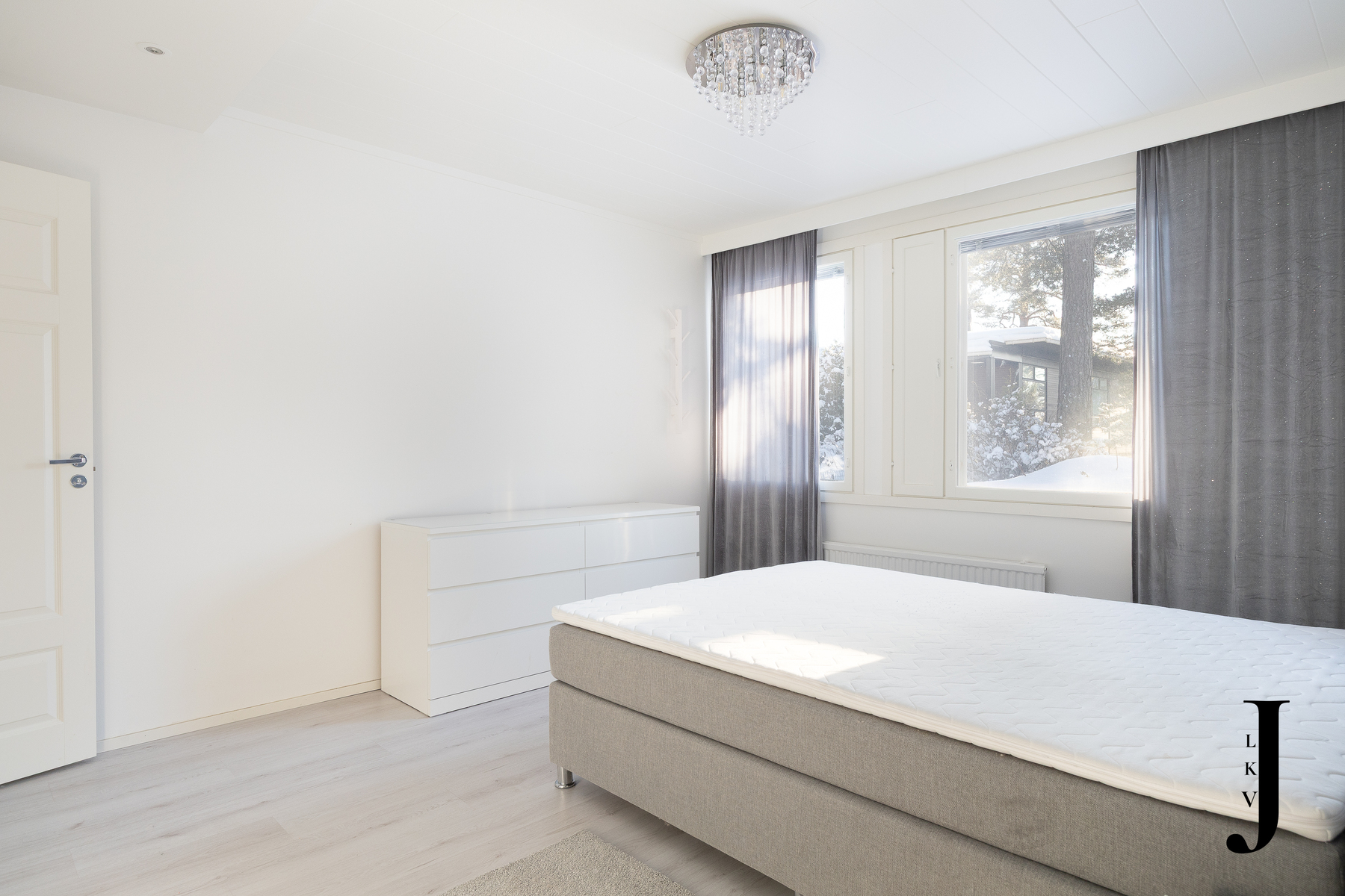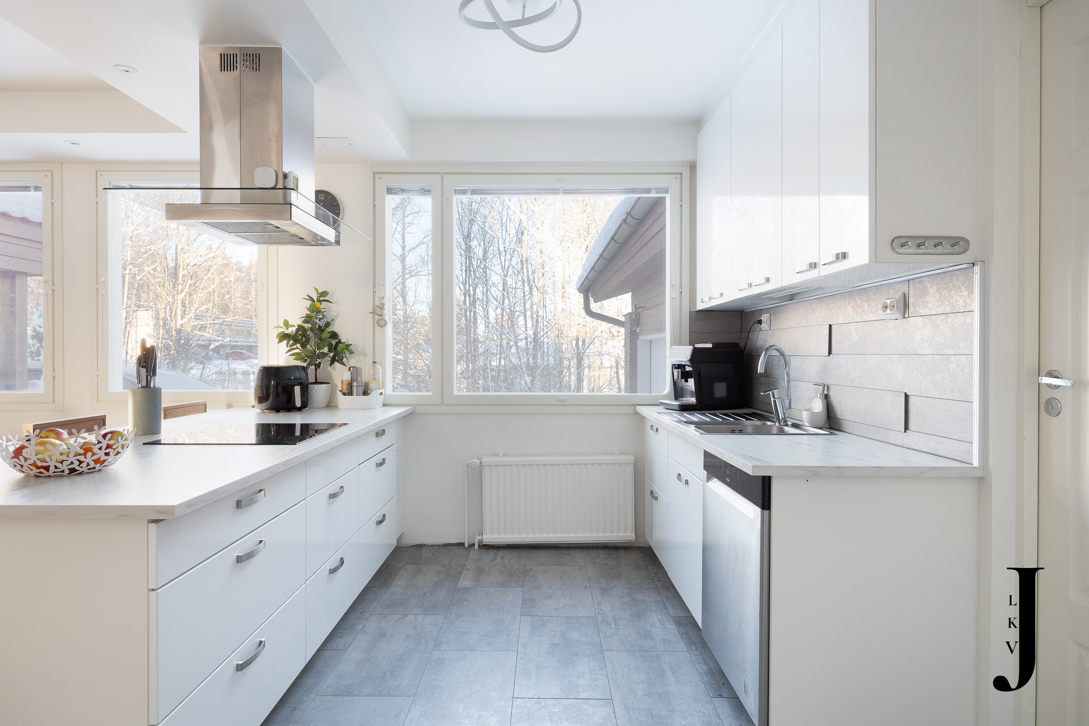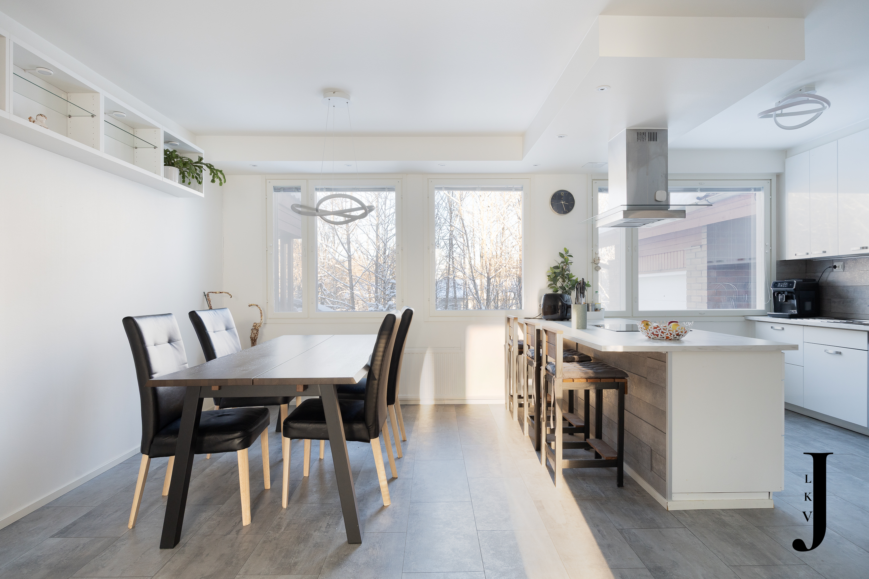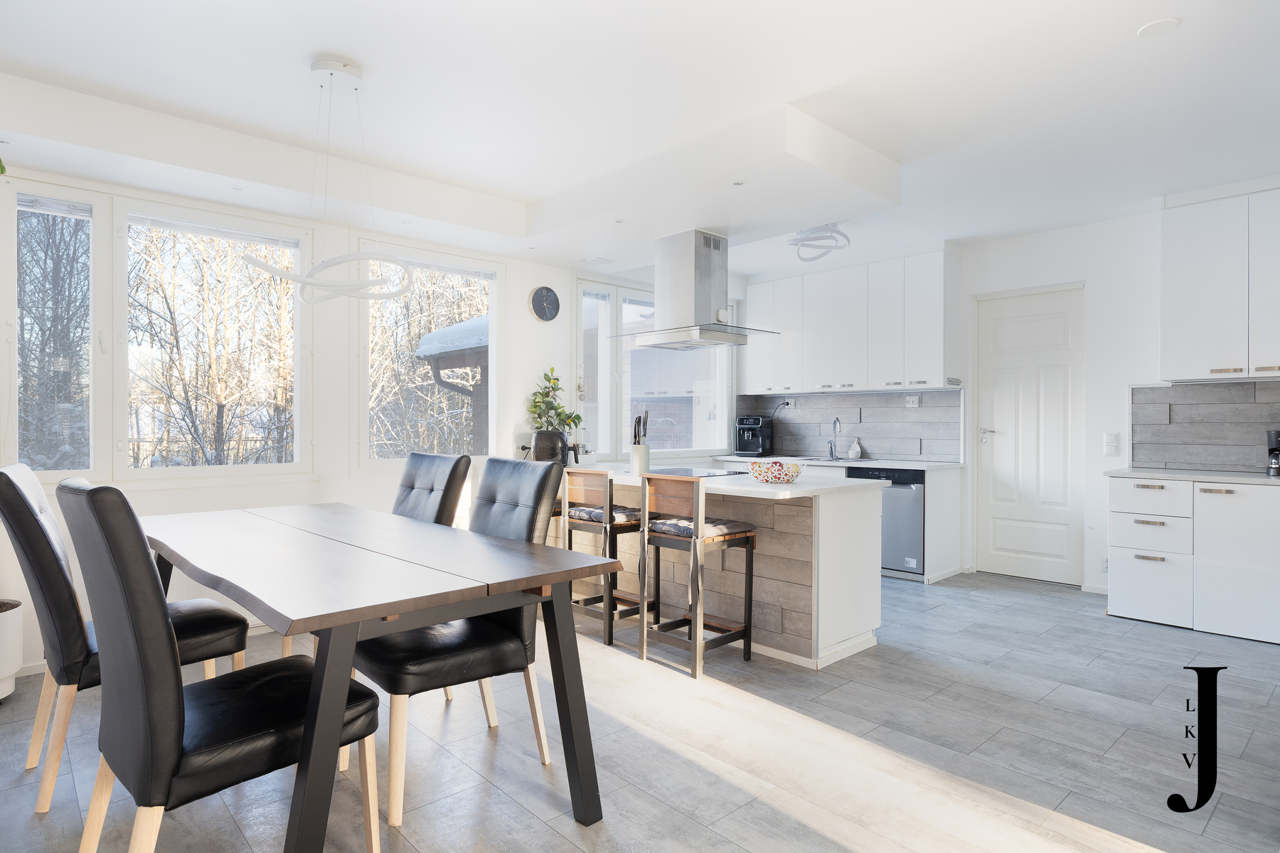 Keittiö on moderni ja käytännöllinen, ja sitä täydentää näyttävä keittiösaareke. Sisäpinnat, lattiat ja ovet on uusittu, ja pesutilat sekä sauna on remontoitu aiemmin. Talotekniikkaa on päivitetty vastaamaan nykyvaatimuksia: talosta löytyy mm. aurinkopaneelit, ilmalämpöpumppu sekä päivitetyt sähköjärjestelmät, jotka parantavat energiatehokkuutta ja asumismukavuutta.